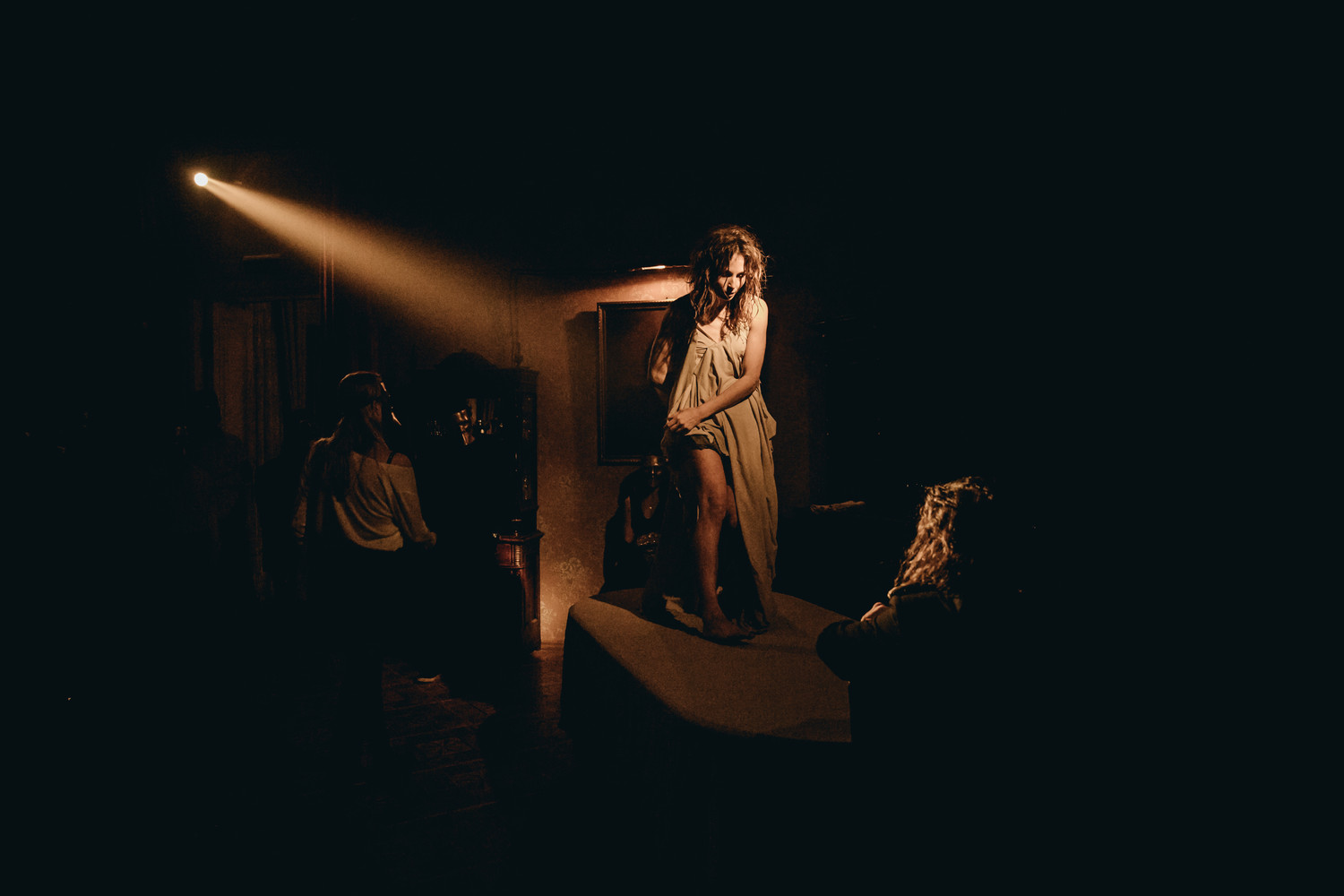 Особняк, конечно, роскошный (жаль, нельзя фотографировать, будто это настоящий театр), но большинство комнат пустует, действия на такое пространство явно не хватает. Вовлечься в него сложно – я перечитал пьесу накануне и понимал, что примерно должно происходить, но если совсем не знать оригинал, останется только упиваться интерьерами и озадаченно смотреть в финале на разговорную драматическую сцену, разыгранную в формате убогого старорежимного театра (тут «Эксперимент» передает привет МХАТУ им. Горького). Весь ибсеновский контент довольно точно по особняку распределен – даже место мастерской безумного художника нашлось, каждое пространство по отдельности и зловеще, и красиво, за каждым – мотивы первоисточника, от сексуальных обсессий до социальных фрустраций, но попробуйте по-настоящему испугаться или хотя бы заинтересоваться в отсутствие героев, интриги, цели и смысла. Для чего потревожили все эти тени? Понятно, для чего: для бизнеса.