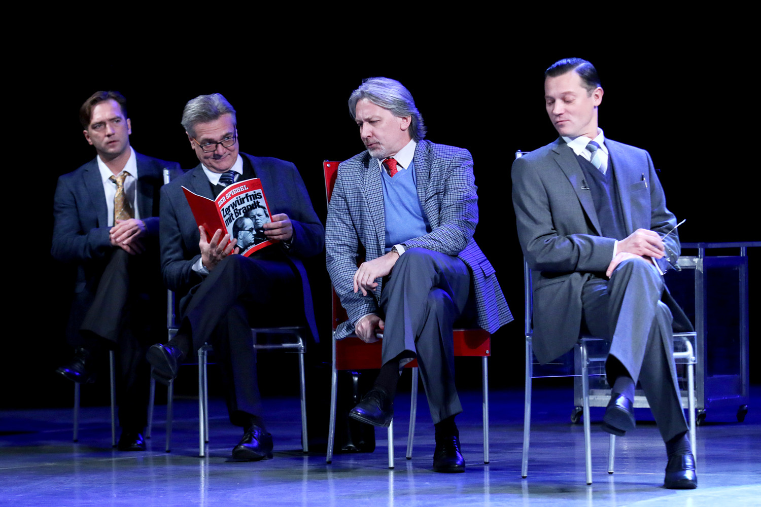 Хотя чего это я, забыл о Льве Додине? Каждый спектакль Додина последних лет (включая идущий сейчас в кинотеатрах «Коварство и любовь») – и художественное, и политическое высказывание. «Страх Любовь Отчаяние» в Малом драматическом театре – театре Европы объединяет несколько текстов Бертольта Брехта: серию драматических сцен «Страх и отчаяние в Третьей империи» и диалог «Разговоры беженцев». Додин не осовременивает действие внешне: на сцене – именно берлинское кафе первой половины 1930-х, с чарльстонами и джаз-бандом за подбитым стеклом в глубине и беженцами, судьями и штурмовиками за столиками на авансцене. Но ставит, конечно же, не про дела и проблемы давно минувших дней.