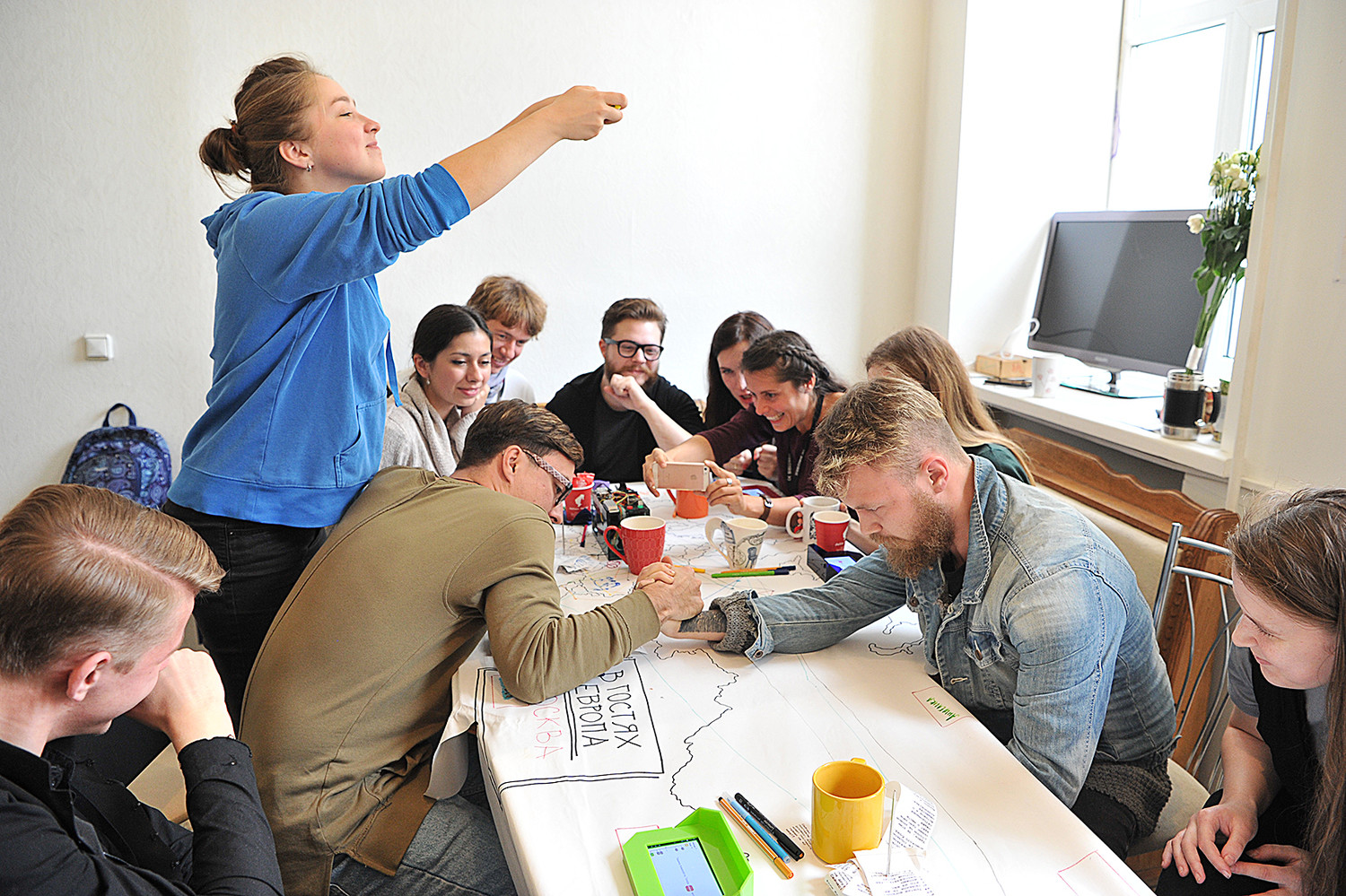 В идеале за этими играми, ведущими к установлению коммуникации между незнакомыми людьми (и дележке бискивтного пирога, что выпекается во время действия в хозяйской духовке), должна проглядывать модель связей, устанавливаемых между политиками на другом, глобальном уровне.