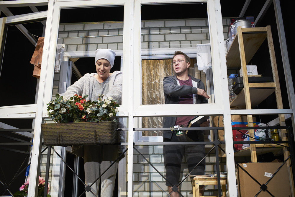 Кулябин придумал потрясающее начало второго действия – от первого его отделяет не антракт, но совершающаяся на глазах у зрителей смена декораций (антракт, если что, между вторым и третьим действиями четырехактной пьесы). Этот слом работает и сам по себе, как художественный прием. Вроде, ничего особенного, подумаешь, техническая перестановка, но цепляет, почти ранит. Вот только что выбегал нервно курить на балкон Иванов, суетился пройдоха Боркин (Александр Новин), шаркал по прихожей дядюшка Шабельский (Виктор Вержбицкий), и Анна-Сарра прежде, чем обреченно броситься вслед за мужем в веселый дом Лебедевых, доставала из духовки рыбу – не с пустыми же руками в гости. Вдруг – затемнение, слаженный выход монтировщиков, и нет никакого панельного дома: так же просто если не рушатся, то радикально меняются человеческие судьбы.