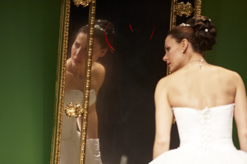 «Зверинец»? Да помилуйте, обычные люди. На сцене – никаких кривых зеркал (те, что есть, – тусклое, мерцающее слабым, словно нездешним светом во втором действии, и огромное, будто вросшее в зеленую стену дворца бракосочетаний, бесстыдно отражающее нелепых и трогательных «брачующихся» – в четвертом). Ну, есть немного намеренного шаржа в уморительной подготовке Авдотьи Назаровны (Ольга Лапшина) к обряду бракосочетания – чеховская «старуха неопределенной профессии» стала вполне еще бойкой бабой из ЗАГСа.