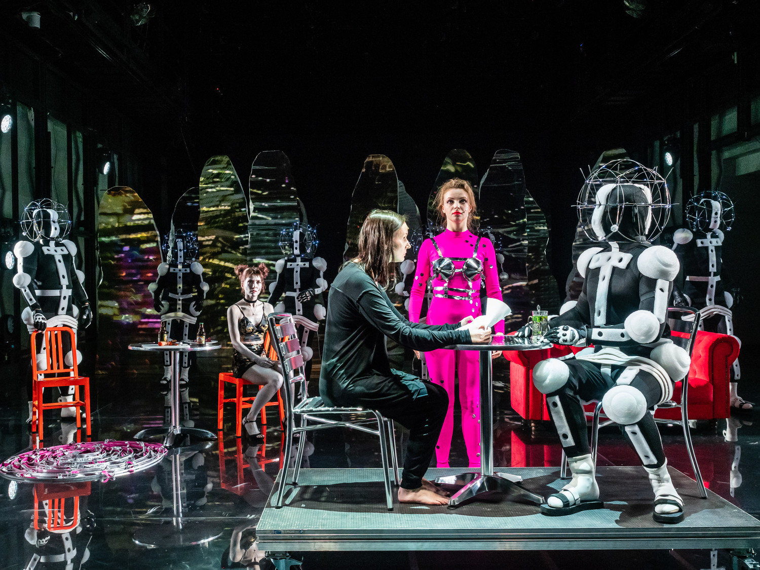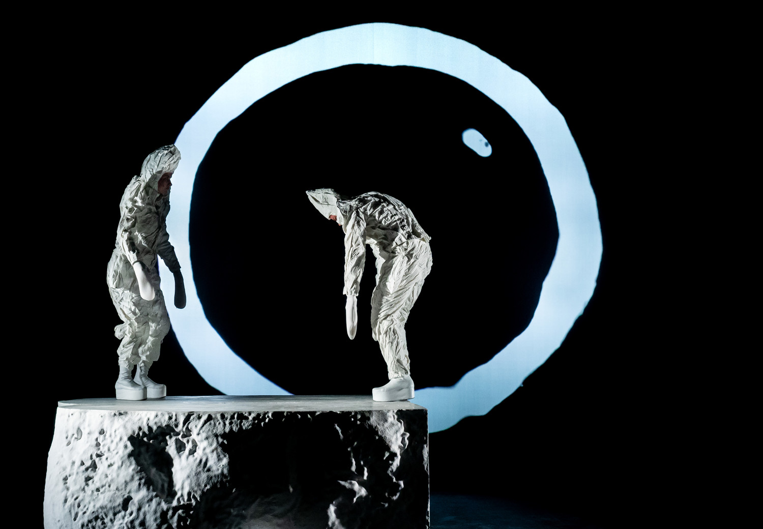 Красный фавн, инопланетные гости в белом и круг, который отражаясь в зеркальной сценической поверхности, превращается в знак бесконечности – тоже из постоянных образов-нитей. А каждый акт завершается либо кодой, либо фейдингом – постепенно наступающей тишиной, медленным «растворением» действия в воздухе.