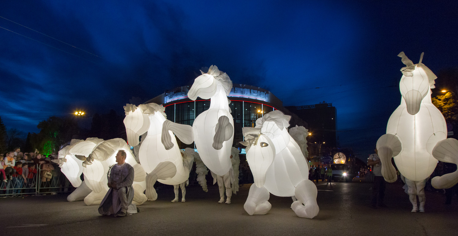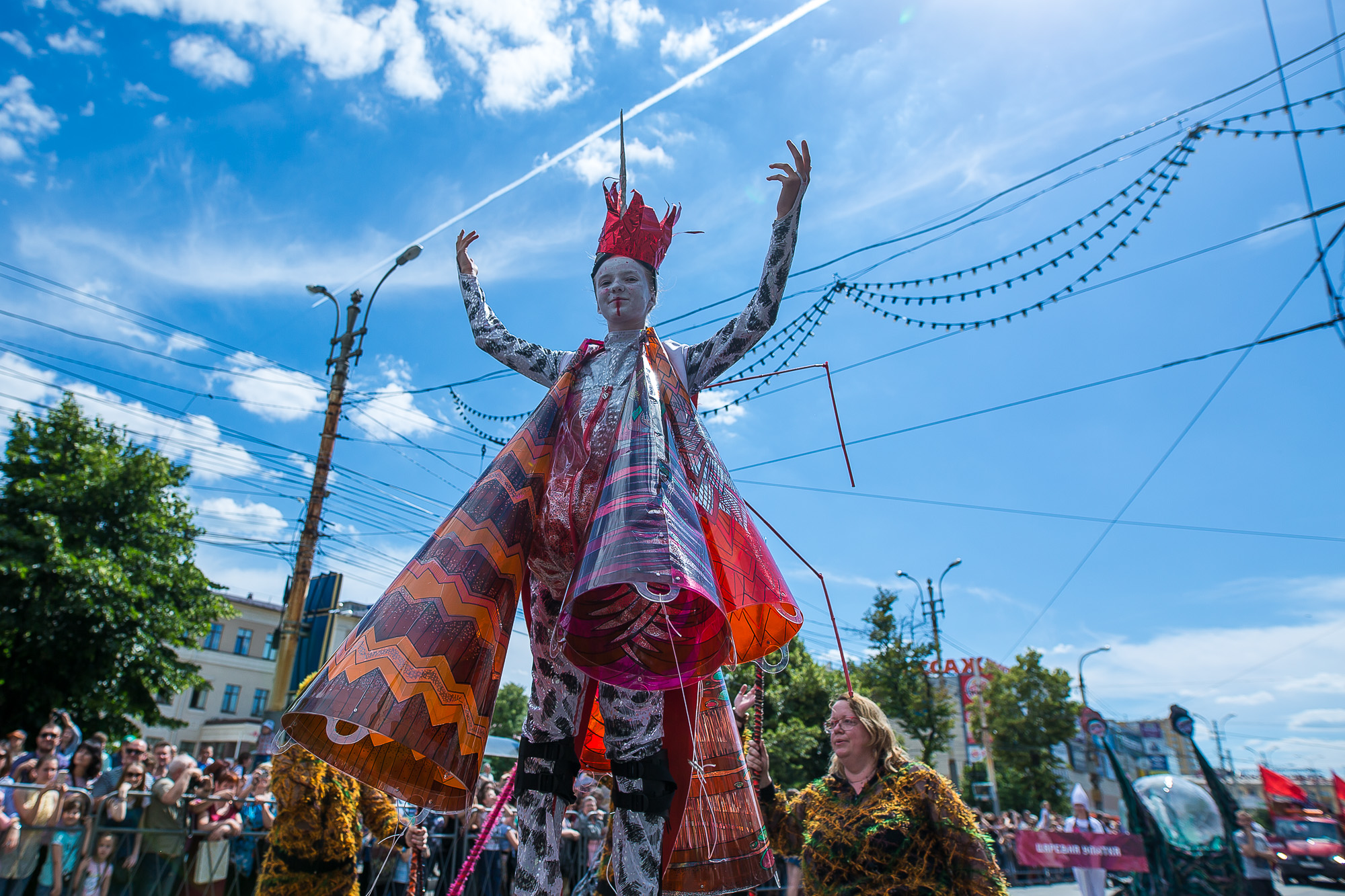 Впервые весь парад стал единым театральным представлением со своей драматургией – Пушкин-трипом, с достойным классика озорством прошагавшим по жизни и творчеству солнца русской культуры. Перформанс в 15 главах открылся прологом «Дуэль»: здесь вооруженный пистолетом взрослый Пушкин встретился с чернокожим малышом – может, самим Пушкиным в детстве, а может, и с прадедом, «арапом Петра Великого», Ибрагимом Петровичем Ганнибалом, который, конечно, когда-то тоже был маленьким. В «Пушкин-апофеозе» по Кирова вальяжно проехала исполинская Голова из «Руслана и Людмилы». А между ними было много чего интересного. И трудноописуемого: уличное представление – как бабочка, которой отмерено жизни на час, самый эфемерный вид театра; вот он есть, бурлит, горланит, переливается цветом и касается зрительских рук, а вот – всё, растворился в воздухе навсегда, и даже никакой внятной видеодокументации не оставил – потому что как зафиксировать всё многоголосье этого подвижного коллективного тела и протяженность в пространстве, вторжение в тихую городскую жизнь, карнавальный ритм и площадной драйв?