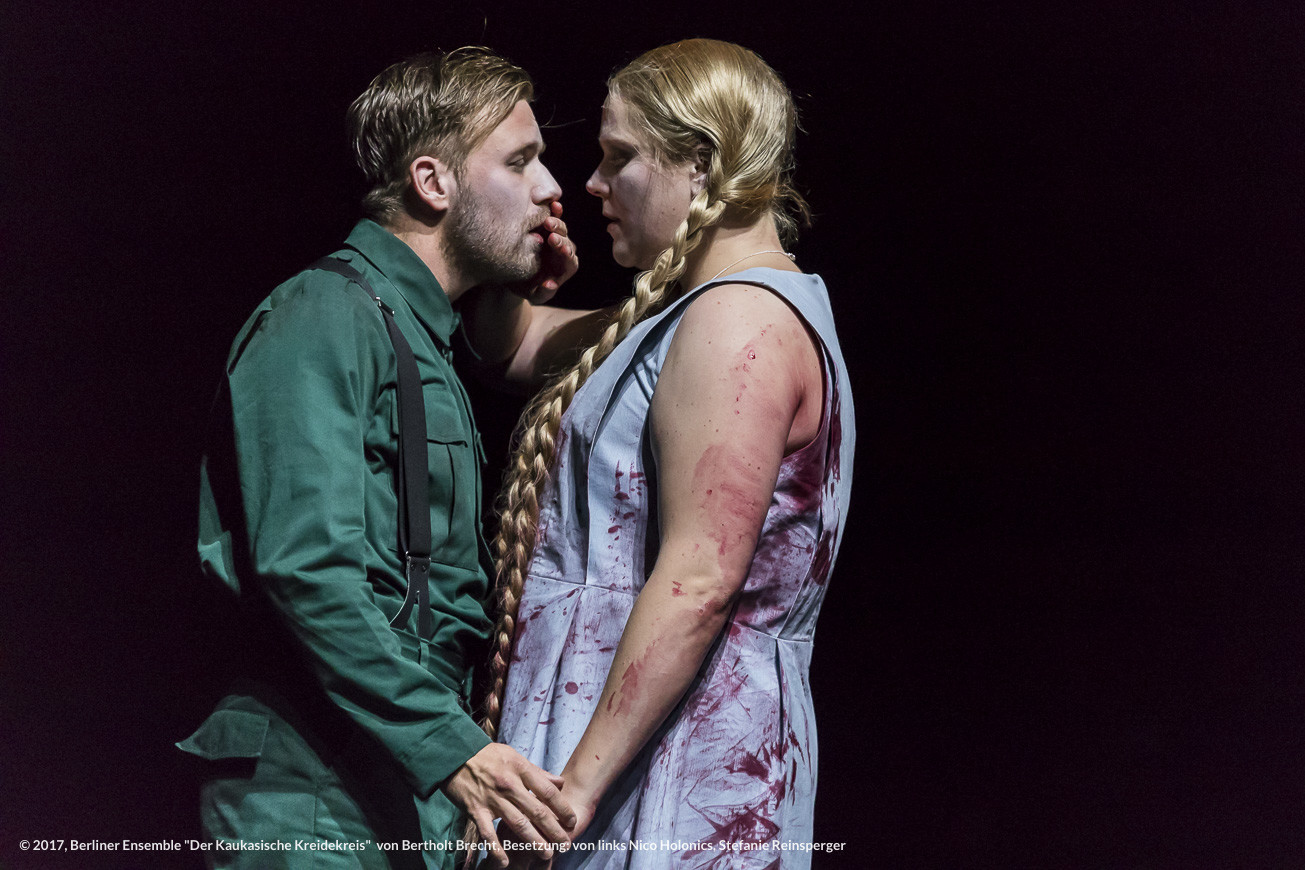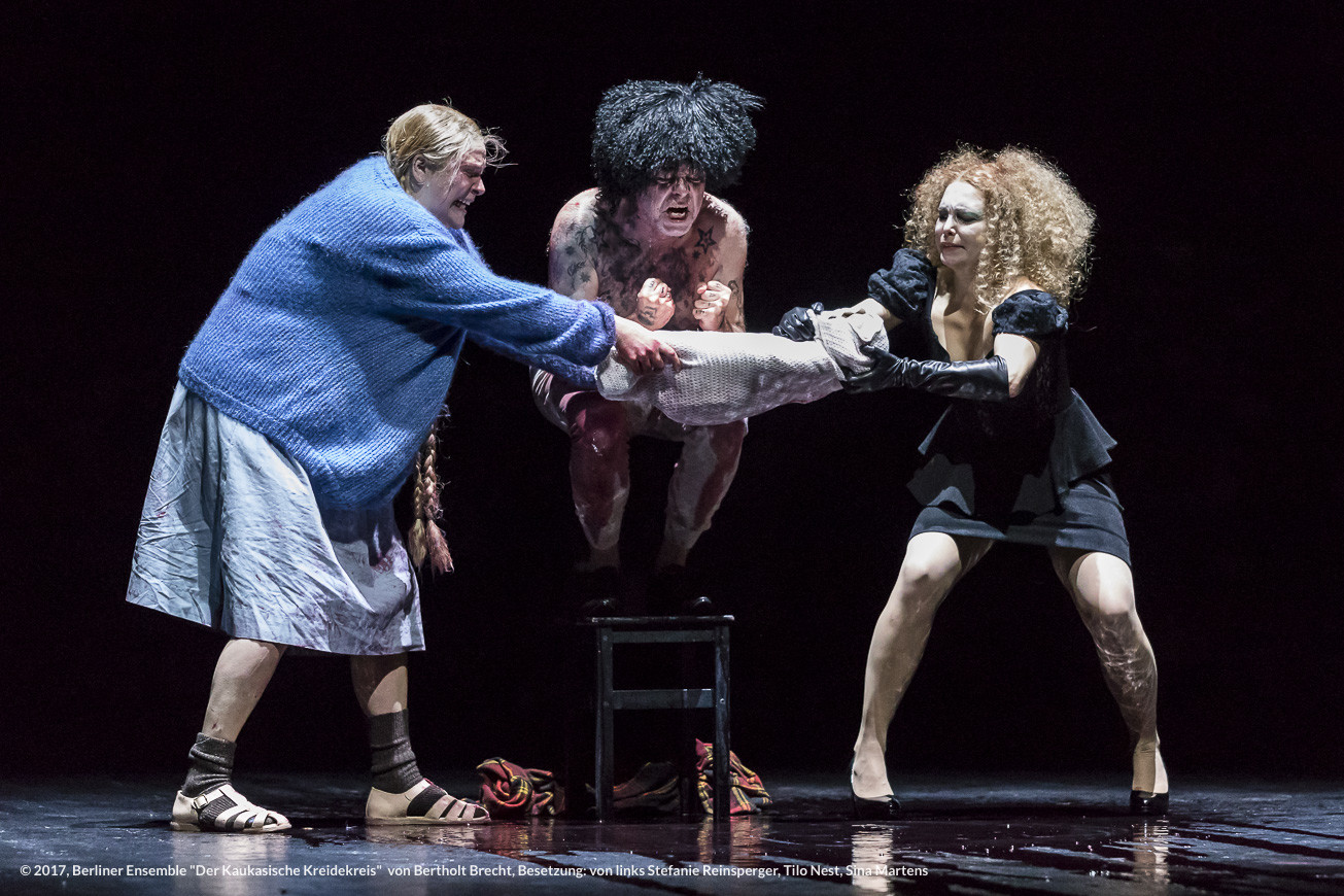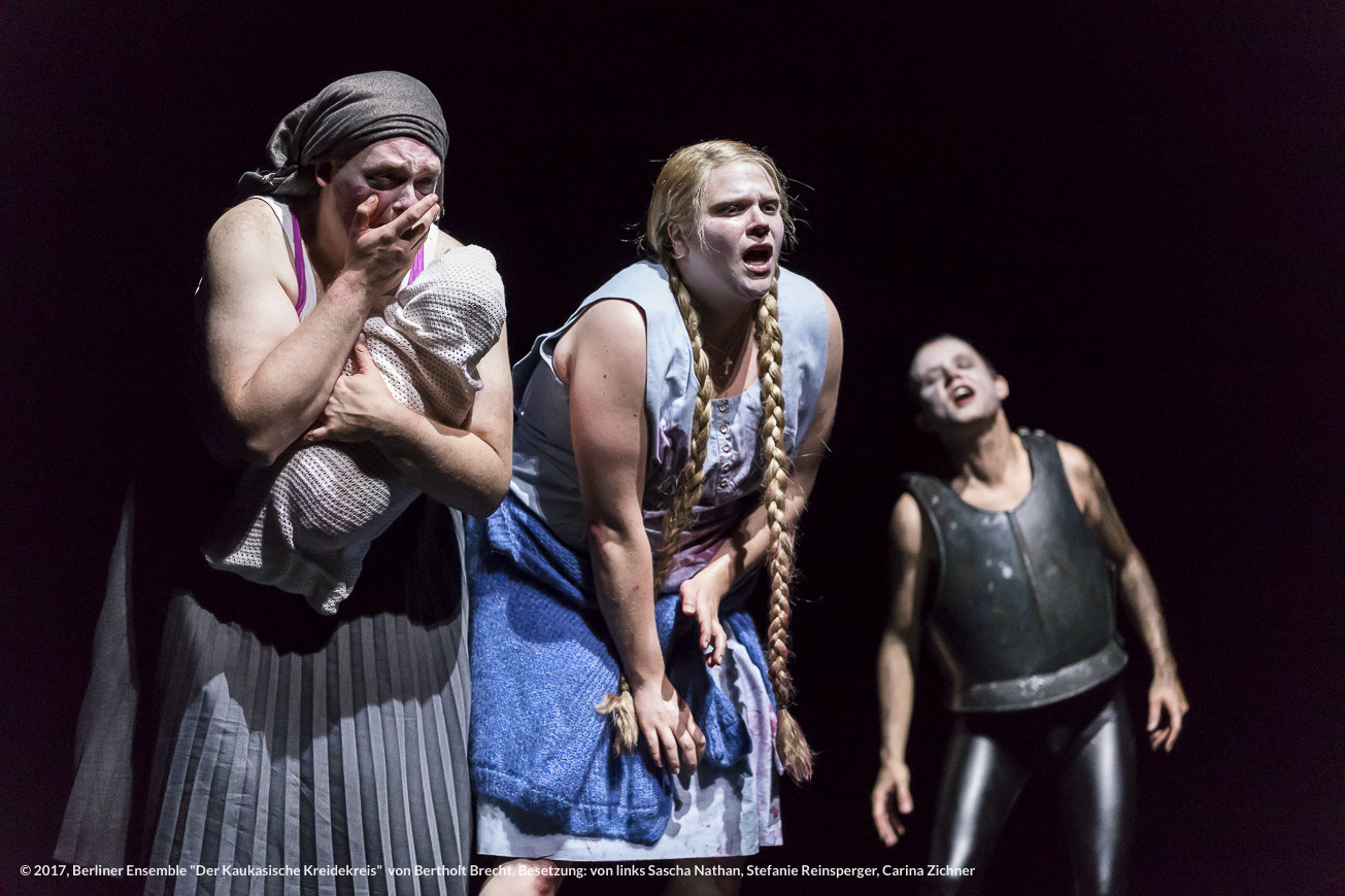 Эпос Брехта превращен в некое подобие рок-концерта – благодаря почти непрерывным музыкальным импровизациям Кая Брюкнера, опытного джазового гитариста. Со стопроцентной рок-энергетикой работает и Штефани Райншпергер, ядро спектакля; она играет брехтовскую Груше Вашадзе, судомойку из мифологической феодальной Грузии, спасшую от расправы грудного ребенка – наследника свергнутого царька-губернатора. Печальное и опасное странствие женщины-изгоя по выжигаемой войной стране – не только антивоенное высказывание; это только самый верхний слой «многоярусной» постановки, которая, оттолкнувшись от социальности Брехта, погружается в глубины человеческой природы.