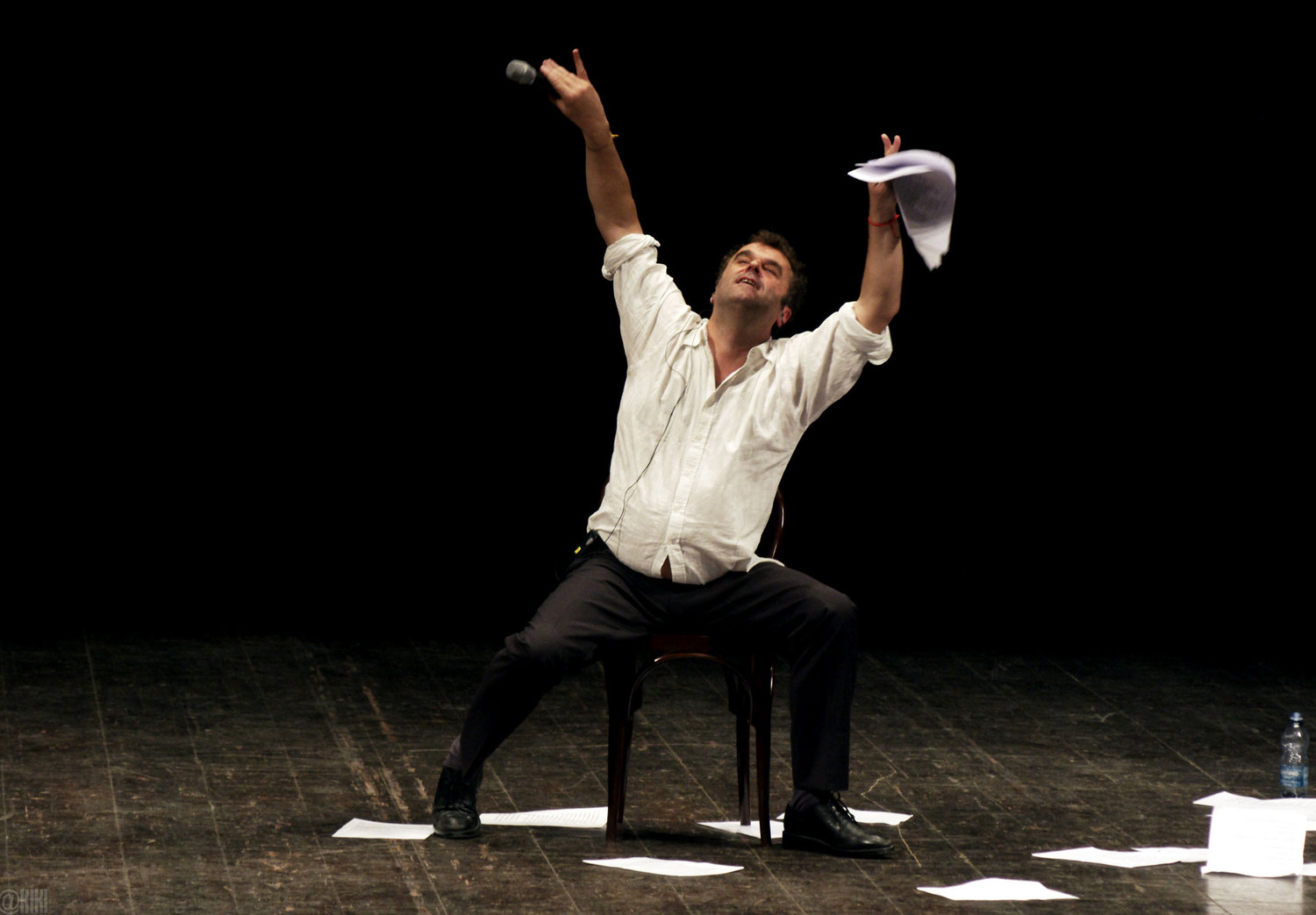 Для большинства воронежцев «Июньские рассказы» стали, полагаю, первым свиданием с Дельбоно. Я уже слышал почти все эти рассказы (о матери, строгой католичке, родившейся в самом ханжеском рыбацком поселке в самой ханжеской части самой ханжеской европейской страны, о первом возлюбленном, подарившем Пиппо свободу странствий и ВИЧ, о глухонемом ангеле-хамелеоне Бобо – он был на воронежском спектакле зрителем и вышел вместе с Дельбно на поклон). Дельбоно ведь, пожалуй, уникальный пример тотального равенства между жизнью и искусством, в его случае границы между ними просто нет, и если хорошо знаешь его спектакли и фильмы (а я видел много, даже писал – кажется, впервые на русском – большой текст о Дельбоно для журнала «Театр»), получается, что знаешь и его самого. Честно, опасался, что буду скучать. Но нет, Дельбоно превосходно держит внимание и без сторонней поддержки, в отсутствие и своей экзотической труппы, и изощренной видеопроекции (предыдущий виденный мной на «Сезоне Станиславского» моноспектакль Дельбоно – «Генрих V» – всё же не был стопроцентно моно, там Пиппо помогали студенты-перформеры), на пустой черной сцене, где из реквизита только микрофон да пивная бутылка. Да и ничего больше не нужно: исповеди Дельбоно произрастают из его многолетних, поистине эпических депрессий, но оказываются мощным антидепрессантом; «Июньские истории» – витальный энергетик, лишь прикидывающийся меланхоличным эксгибиционистским сторителингом.