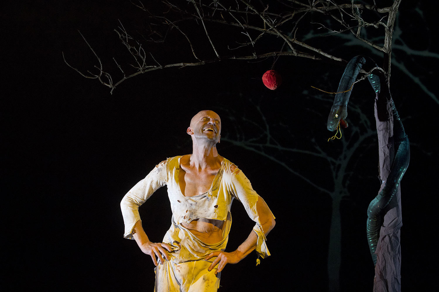 На Платоновском забористой Пушкин-клоунаде предшествовали два звездных и пафосных моноспектакля. Один – клоунский официально, «Последний клоун на Земле» Антона Адасинского (даром, что родился, по словам автора, из страха и отвращения к привычным Бимам и Бомам), полутарочасовое one man show, в котором сам Адасинский растраивается: на самого себя, во плоти, в заглавной роли, и на двух персонажей из видеопроекции – Бога и Дьявола. В хитрую игру с творцами добра и зла вступает постапокалиптический оборвыш, который пробивает лбом невидимую четвертую стену, чтобы выйти на сцену. Сцена здесь, понятное дело, не просто сцена (воронежского ТЮЗа), но буфер между мирами (где возможен пластический диалог с библейским змием), гладиаторская арена (где на бой вызывают и день, и ночь, и свет, и тьма), лобное место (для самопожертвенного заклания) и Сцена с большой буквы (где только и может по-настоящему жить актер).