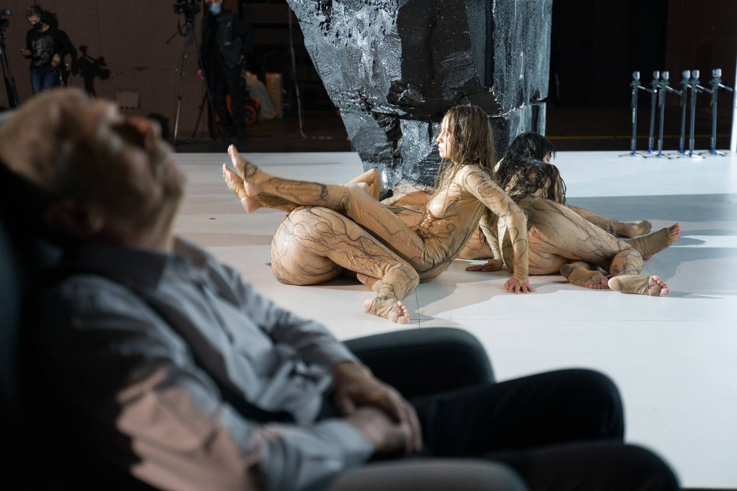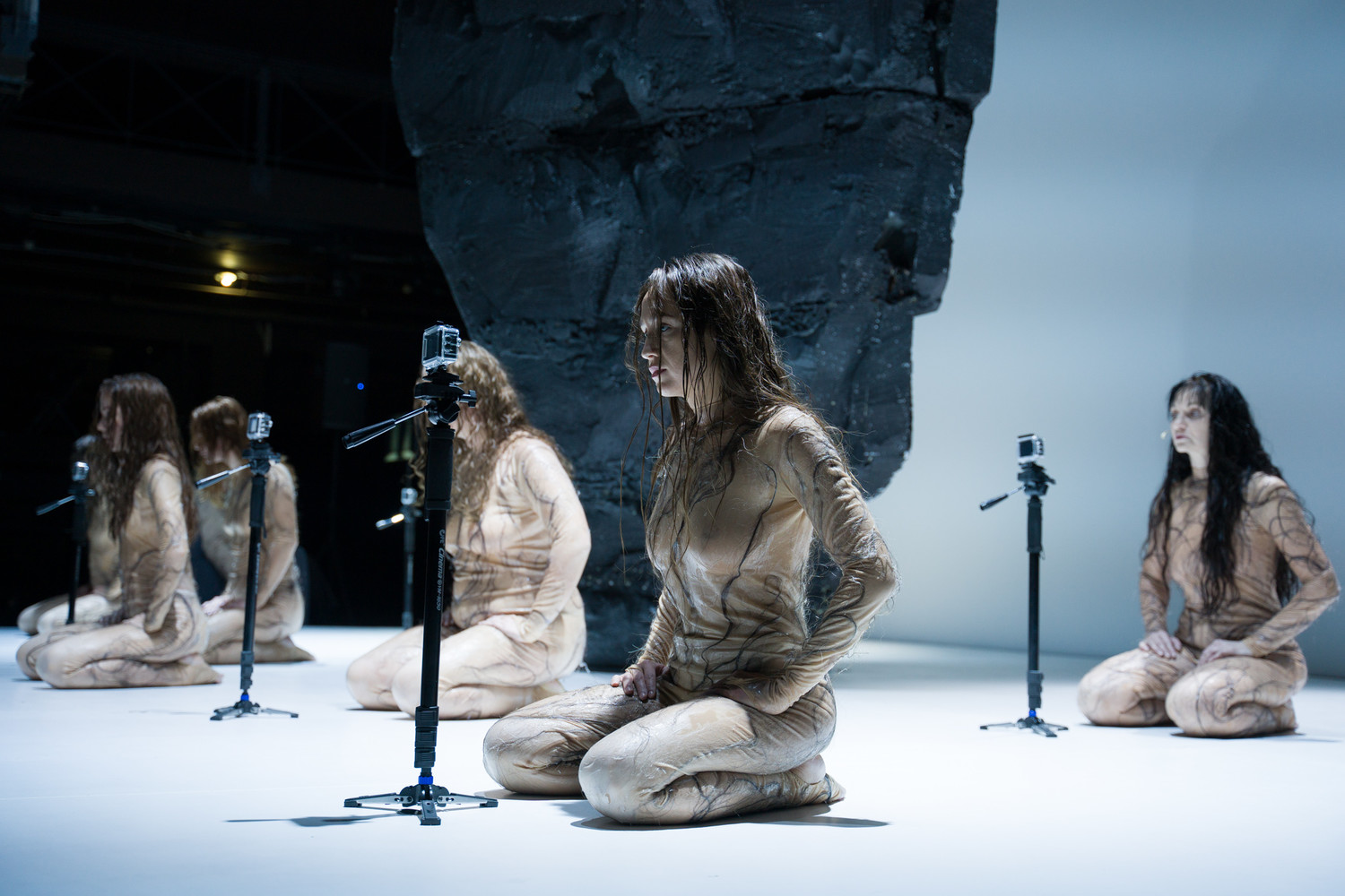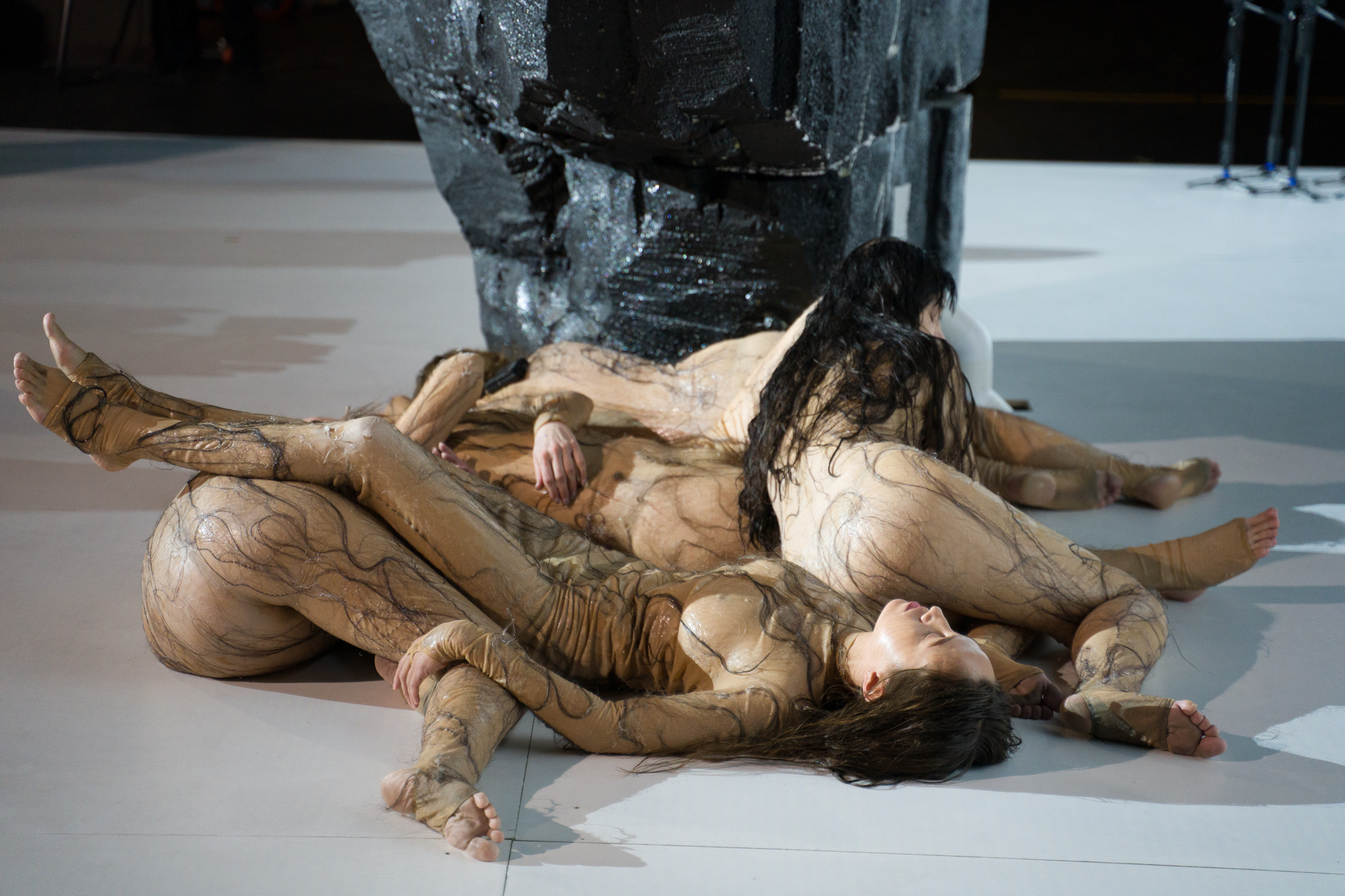 Этот спектакль, хоть и играется, как принято, на сцене, тоже театр тотальный, вовлекающий тебя с порога – огромной, соразмерной сценическому пространству инсталляции из мониторов и покрытых чёрными волосами силиконовых объектах;