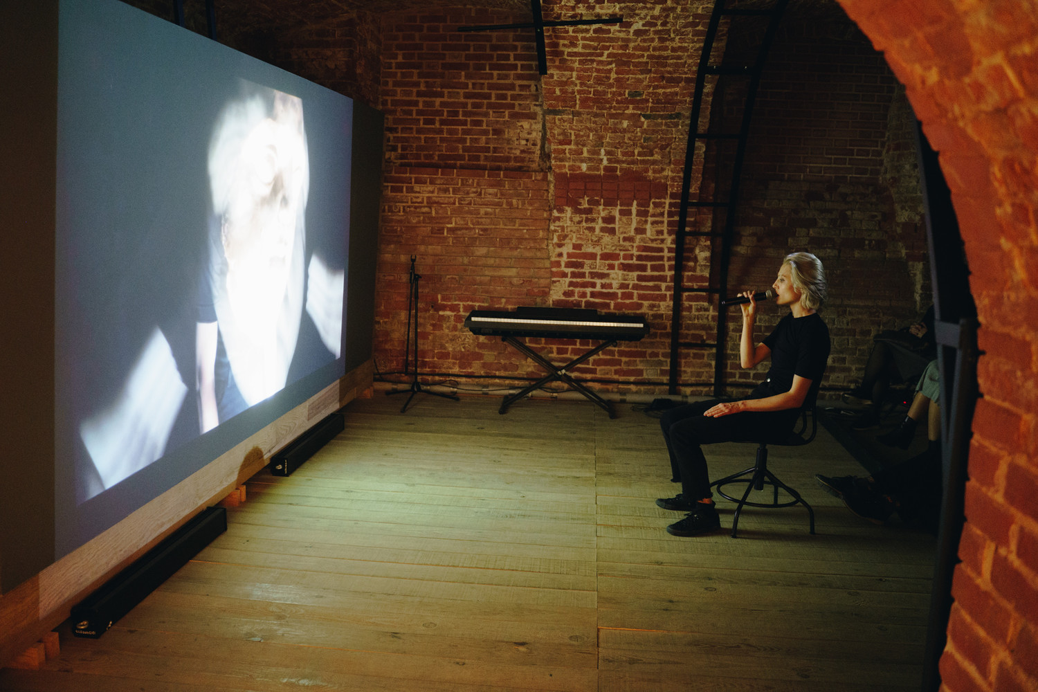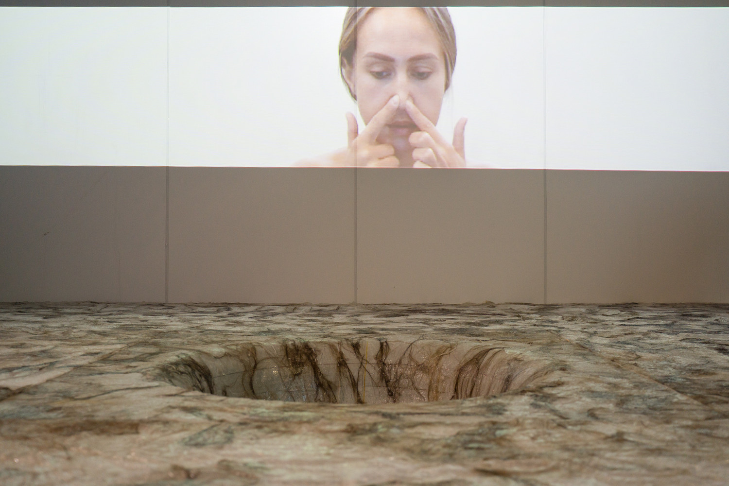 в некоторых можно рассмотреть фрагменты тел, некоторые – как занимающая центральную часть платформа с круглым углублением в центре – абстрактны. На мониторах – актрисы; отдельно – микрофон, в который каждый может произнести что угодно, и эта фраза впоследствии вольётся в звуковой фон инсталляции. Я, правда, не понял, как это происходит и происходит ли вообще, но приятно ощущать себя не сторонним наблюдателем, а участником процесса.
