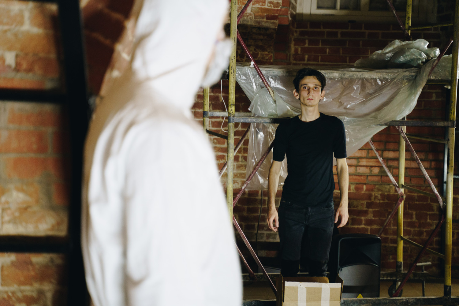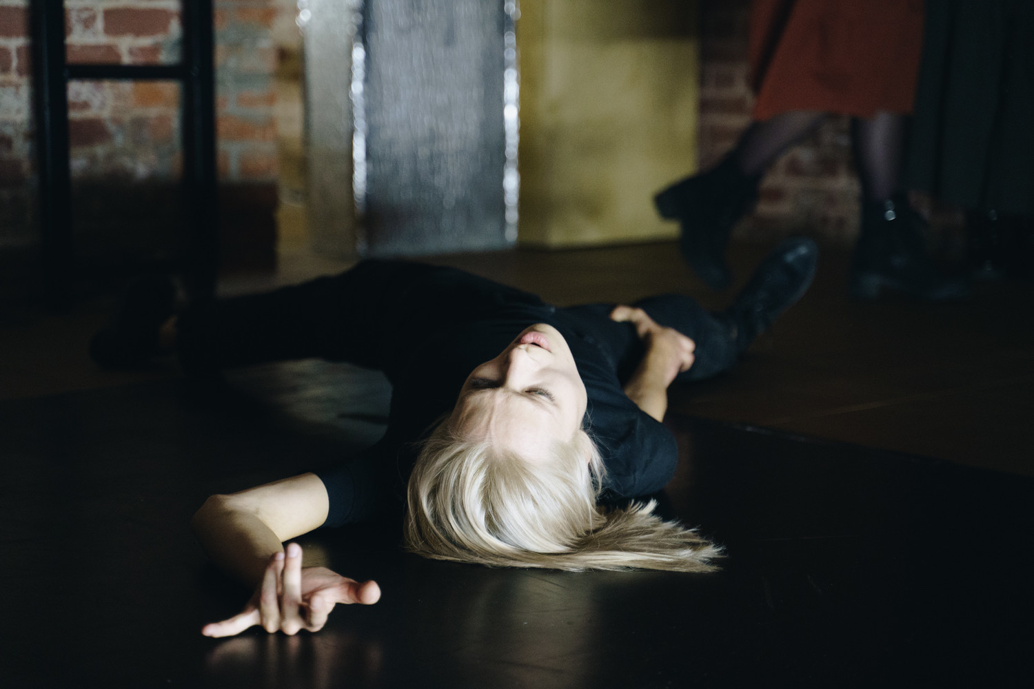 В Краснодаре «Жизнь мертвецов» происходила в здании бывшей типографии «Советская Кубань», где зрители, разбитые на несколько групп, последовательно перемещались от эпизода к эпизоду. Московский подвал Нового Пространства в разы меньше индустриального исполина, границы между секторами, в которых игрался спектакль, условны. Можно было, конечно, создать маршрут самому, наугад – силой воли заставив себя смотреть каждый фрагмент от начала до конца, не перемещаясь в соседний зал до короткой паузы, отделяющей один сет от другого. Можно, но сложно, если хочешь за раз охватить всё; я выбрал такой путь и получил, скорее, объёмный дайджест спектакля.
