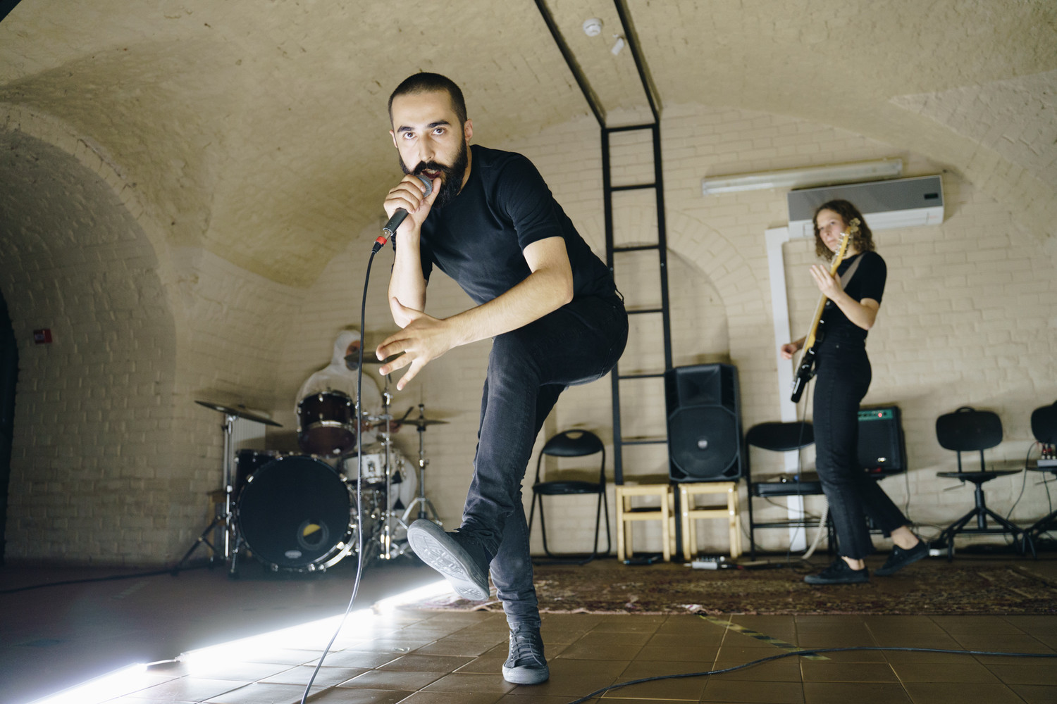 Пунктиром – так: первый от входа зал – подобие рок-клуба, последний – как бы кинотеатр, но и проекции (очень разные – видеоарт, озвученный интимными воспоминаниями об умирании близких, немой фильм-текст, состоящий только из титров, стилизация под чёрно-белую поэтику «некрореалиста» Евгения Юфита) идут в присутствии актеров. Между пунктами «отправления и прибытия» – несколько площадок, на которых могут разворачиваться и мистериальные фантазии, и исповедальные монологи, и иммерсивные приключения, самым памятным из которых для меня стало то, где предлагается просто сидеть в темноте, «отключив» слух строительными противошумными наушниками. В следующем за рок-сценой отсеке установлен монитор, транслирующий запись оригинального, краснодарского трипа.