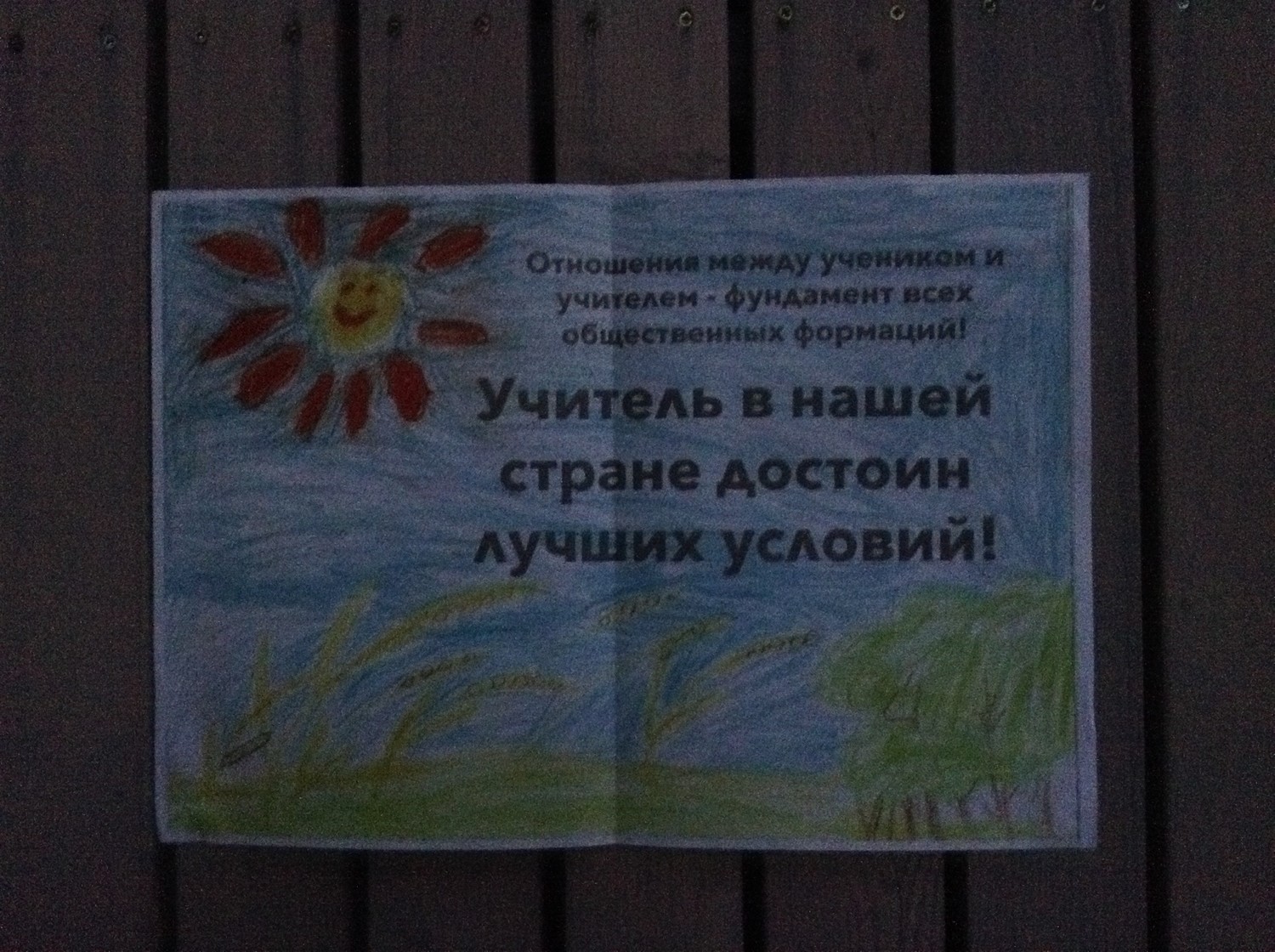 В момент одного из перемещений, когда моя группа устремилась за Аркадиной, быстро шагавшей по траве на высоченных каблуках, я (хоть и был в кроссовках) чуть поотстал и увидел, что Медведенко что-то такое прикрепляет к деревьям. Путь наш лежал к дому, полному мультимедийных чудес: в нем Аркадина превращалась в голограмму (а рот Треплева перемещался на потолок – я подсмотрел, затесавшись в чужую группу). Потом было ещё джазовое выступление Аркадиной-звезды на открытой веранде; но, несмотря на сильные впечатления, я всё же не позабыл рассмотреть, чем был занят скромняга Медведенко. И открыл в герое тихого борца: на деревьях и стенах деревянных домиков висели воззвания «Учитель в нашей стране достоин лучших условий!», «Недопустимо платить гроши человеку, который призван воспитывать народ!», «Родитель! Если хочешь уважения – будь его достоин».