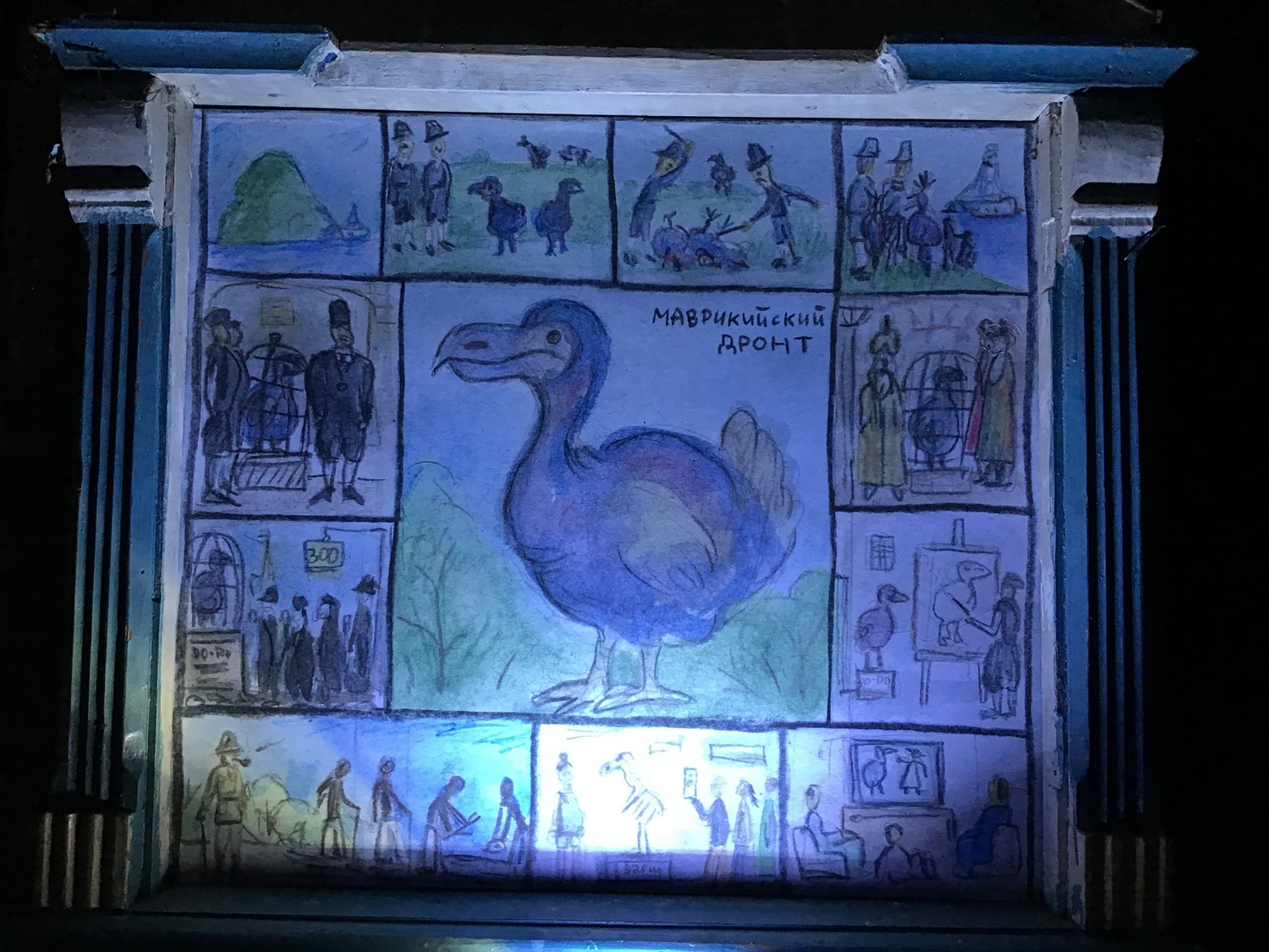 сглажен отсутствием дистанции со зрителем и стилизованным примитивизмом картин в старинных деревянных наличниках. На картинах – птицы, которых больше нет даже в Красной книге; про дронта я знал – благодаря ижевской электронной группе «Самцы дронта», но за сотни лет активного освоения планеты с её поверхности исчезла ещё дюжина видов. В пёстрых, обманчиво игривых комиксах – пласты истории насилия и подавления; быстрого взгляда достаточно, чтобы осознать.