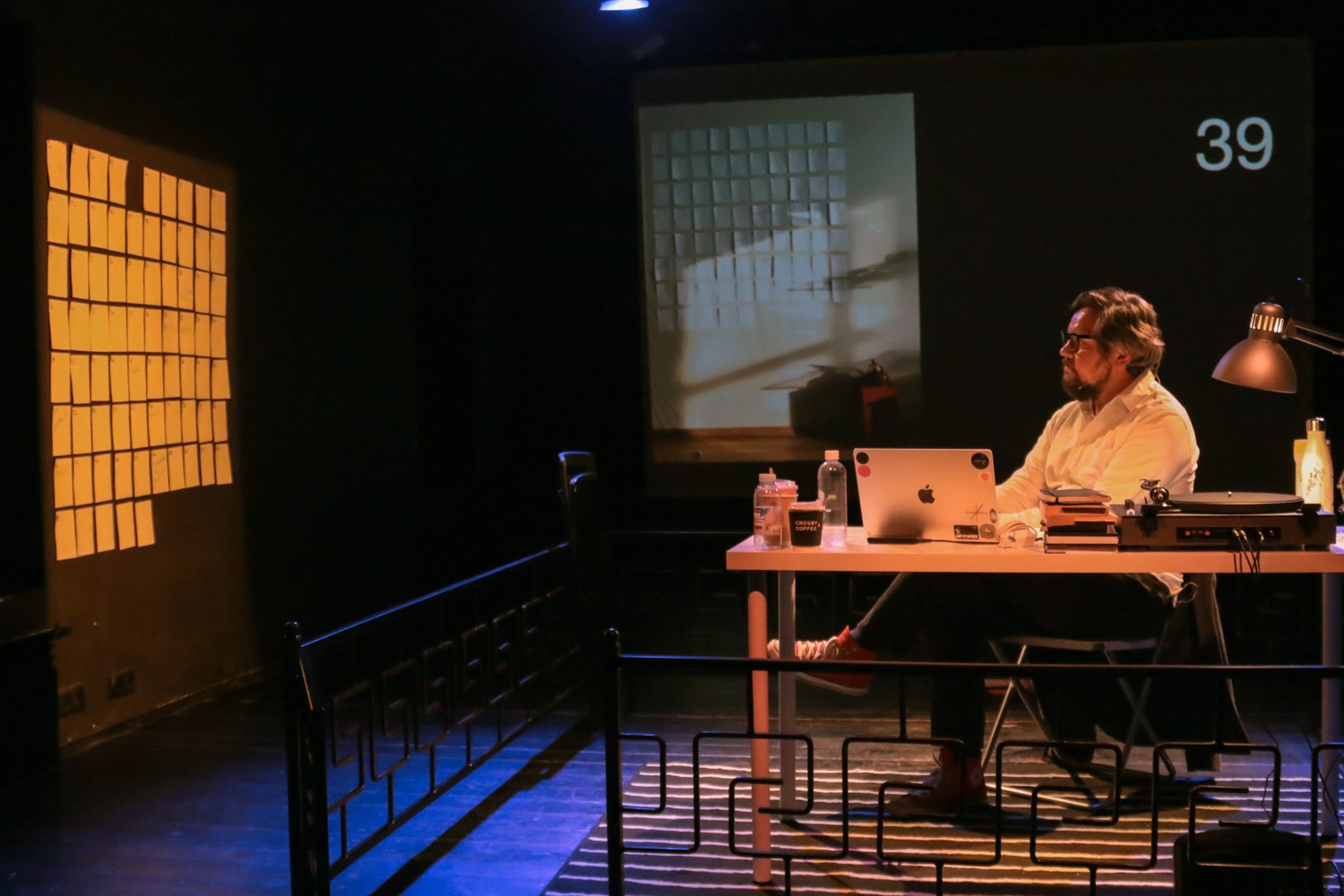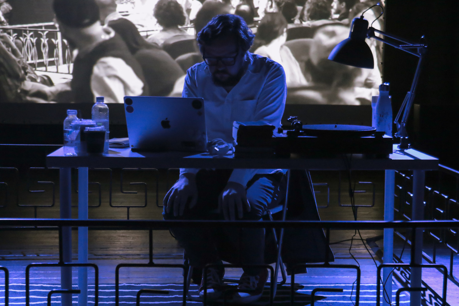 Сам Волкострелов – автор-исполнитель, в данном случае буквально великий бард – сидит за столом с ноутбуком, виниловым проигрывателем, блокнотом-дневником и ещё парой-тройкой вещей;