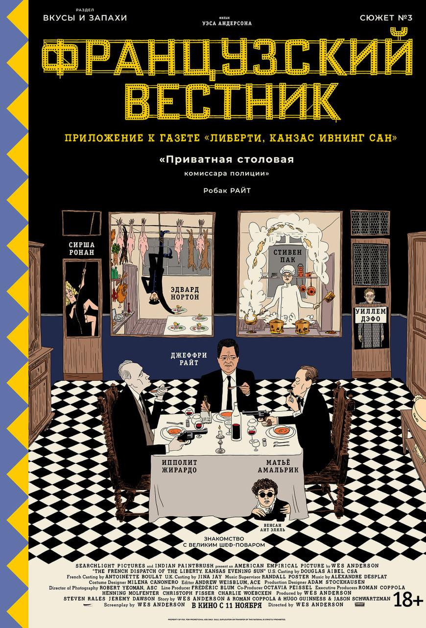 Нет нужды говорить, что Андерсон и сам мастер точёных кинематографических фраз, друг парадоксов, бог стиля и вообще гений. Но даже на мой взгляд, беспринципно влюблённый в андерсоновские миры, разом и инфантильные, и отрезвляющие горчащей взрослой мудростью, гениальности в «Вестнике» полно, а лёгкость куда-то улетучилась. Совсем; это как изрядно избыточный, уже сбивавшийся с полёта на одышливый шаг «Отель «Гранд Будапешт», только теперь «будапештская» избыточность возведена в квадрат. Здесь чересчур много всего – звёзд, острословия (и в прямом, и в переносном смысле – слова звучат, слова бегут по экрану надписями, и кадры трещат от обилия визуальных деталей), упоения своим режиссёрским мастерством.