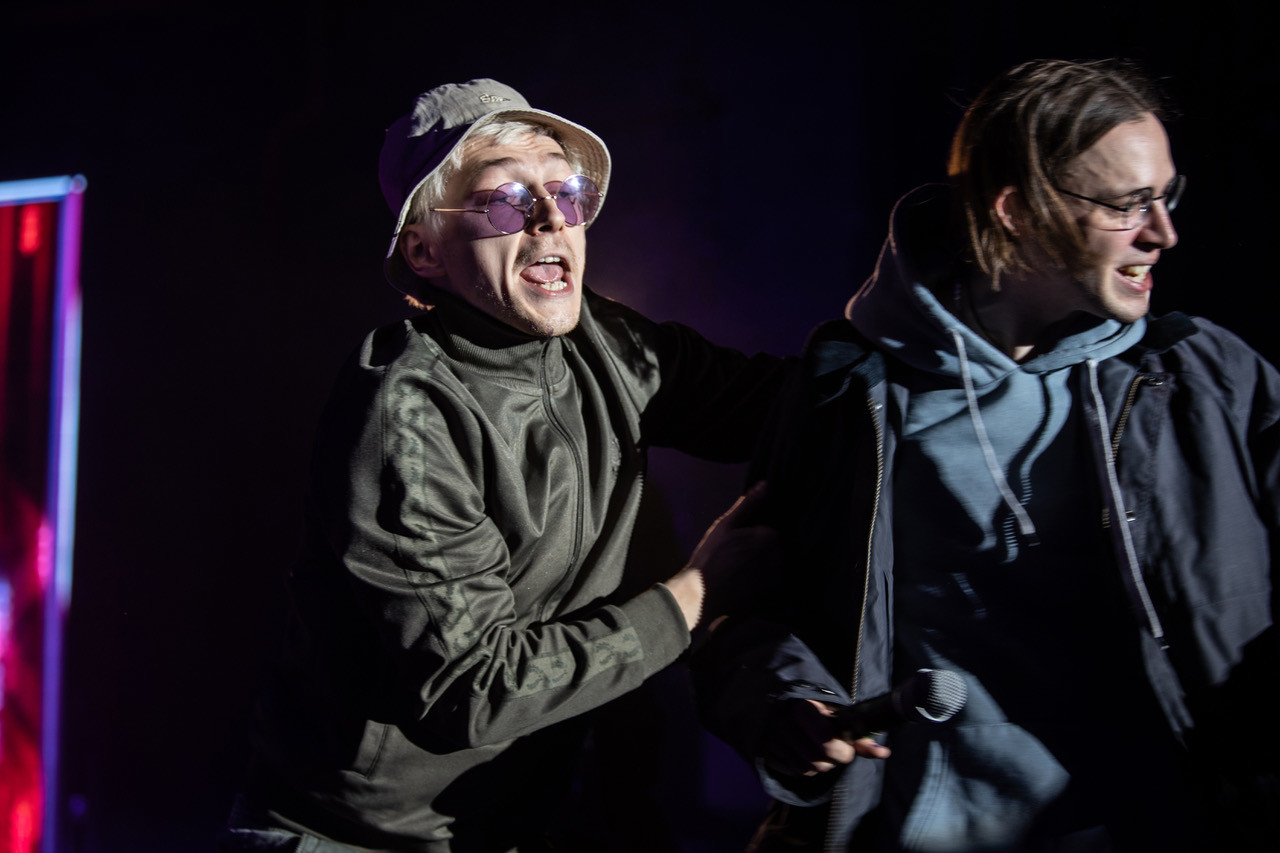Пролог – чистый фэнтэзи: явление трёх ведьм. У Томпсона, автобиографический сюжет которого прославил фильм Терри Гиллиама с Джонни Деппом и Бенисио дель Торо, два отморозка средних лет, журналист и его адвокат, мчат в Лас-Вегас для написания репортажа об автогонке. По дороге обжираются запрещёнными веществами, вследствие чего выпадают из реальности. В пьесе Прокопьева два юных флексера, несколько застенчивый журналист Фил (Василий Михайлов) и его лишённый всякого стыда кореш, «дикий тайгер» Саша (Александр Горчилин), ведомые звездой Наркурием, тоже планируют отписать репортаж – об очередной глянцевой церемонии «Человек по версии 2021 года», но предварительно едут за закладкой и становятся жертвами ведьминских козней. Злодейки прикатили в «голодную Москву» с целью погрузить город в амфетаминовый и прочий мрак, для чего оставили на видном месте целую сумку, набитую чёрт знает чем. У Томпсона её содержимое было бы описано без умолчаний, Прокопьев переделывает оригинальную цитату в задиристый юмористический спич: «у нас было два пакета Роскомнадзора, семьдесят пять таблеток Роскомнадзора, пять марок мощнейшего Роскомнадзора, ящик пива и пинта Роскомнадзора». Перестраховка в наше цензурно обострённое время лишней не бывает, что ни затронь – от кого-нибудь да прилетит. Впрочем, то, что спектакль далёк от нелегальной пропаганды, понятно и без встречающего зрителей предупреждения на экране: «Наркомания – это рабство. Гоголь-центр за свободу. Не употребляйте наркотики, будьте свободными».