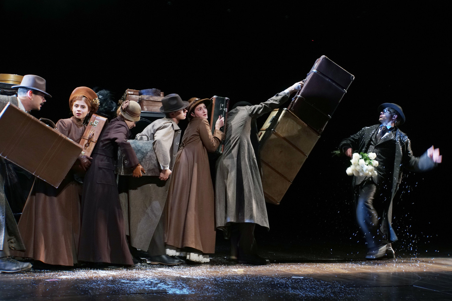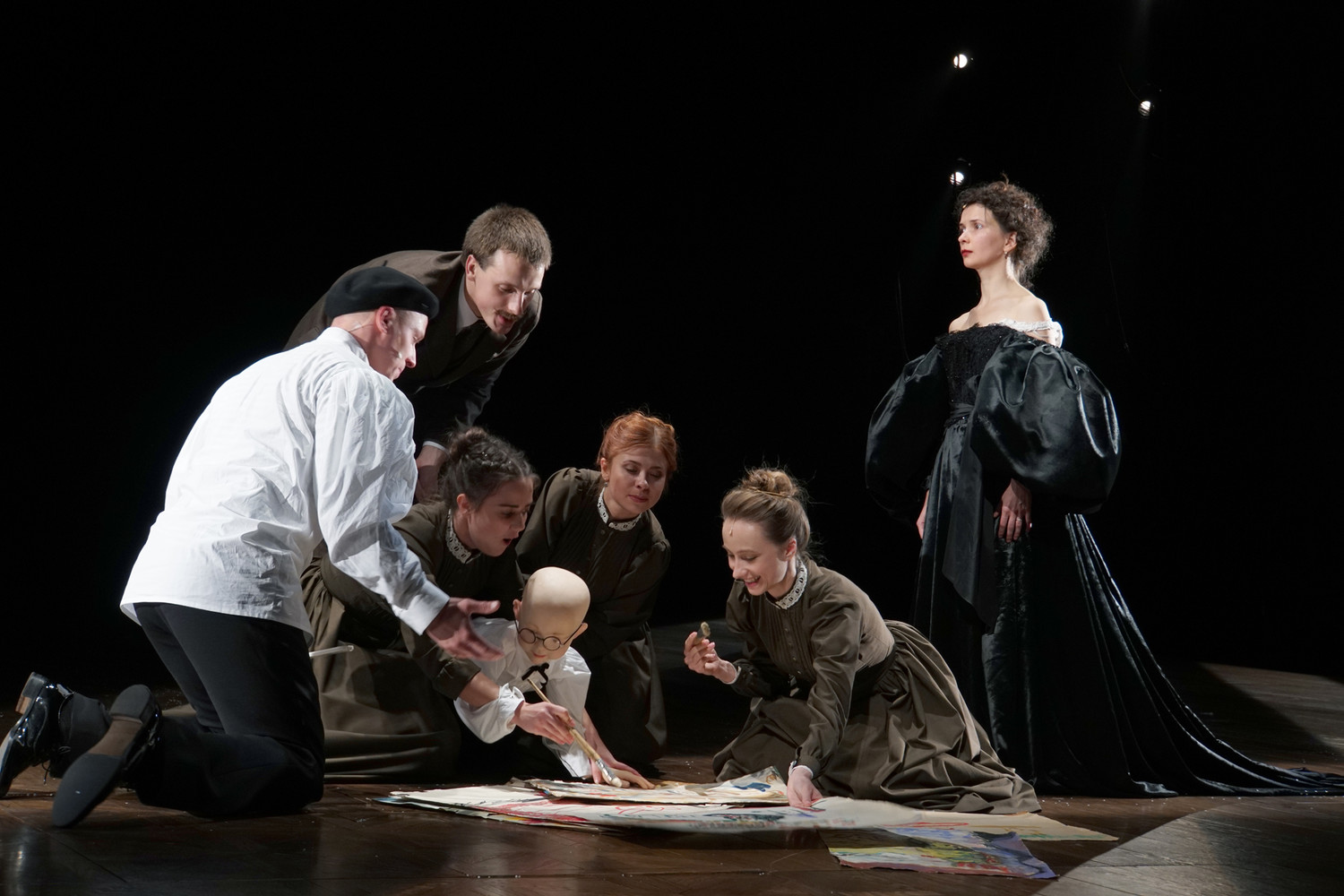 Лев Толстой в фантазиях Дмитрия Крымова: Анна Каренина (Мария Смольникова) – чудачка, клоун, егоза, приделывает плафон, опасно балансируя на «многоуважаемой» лестнице, и покупает сыночку в подарок дрон; игрушки и лифчики взрываются; Каренин (Анатолий Белый) не смешон, даром что носит бутафорские оленьи рога, умеренно педантичен – чтобы расходовать энергию не на ориентацию в пространстве, а на добрые дела, и прячет слёзы за смехом; «Вернись в Сорренто»; чайка на мхатовском занавесе как часть сценографии; Серёжа Каренин – кукла, похожая на Прокофьева.