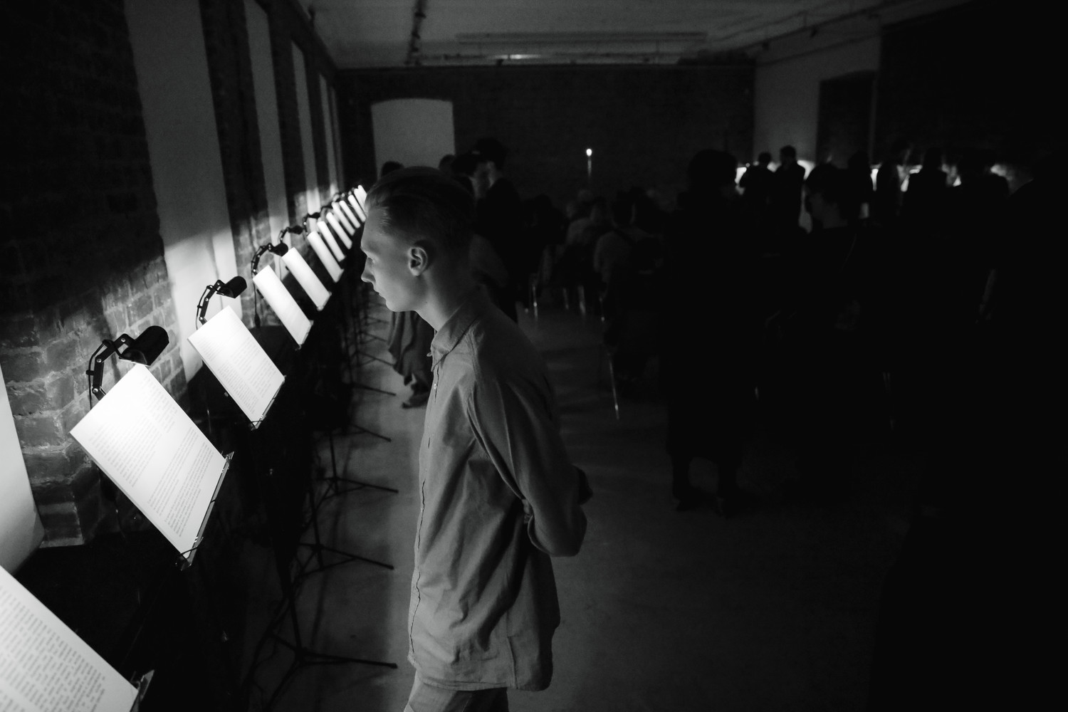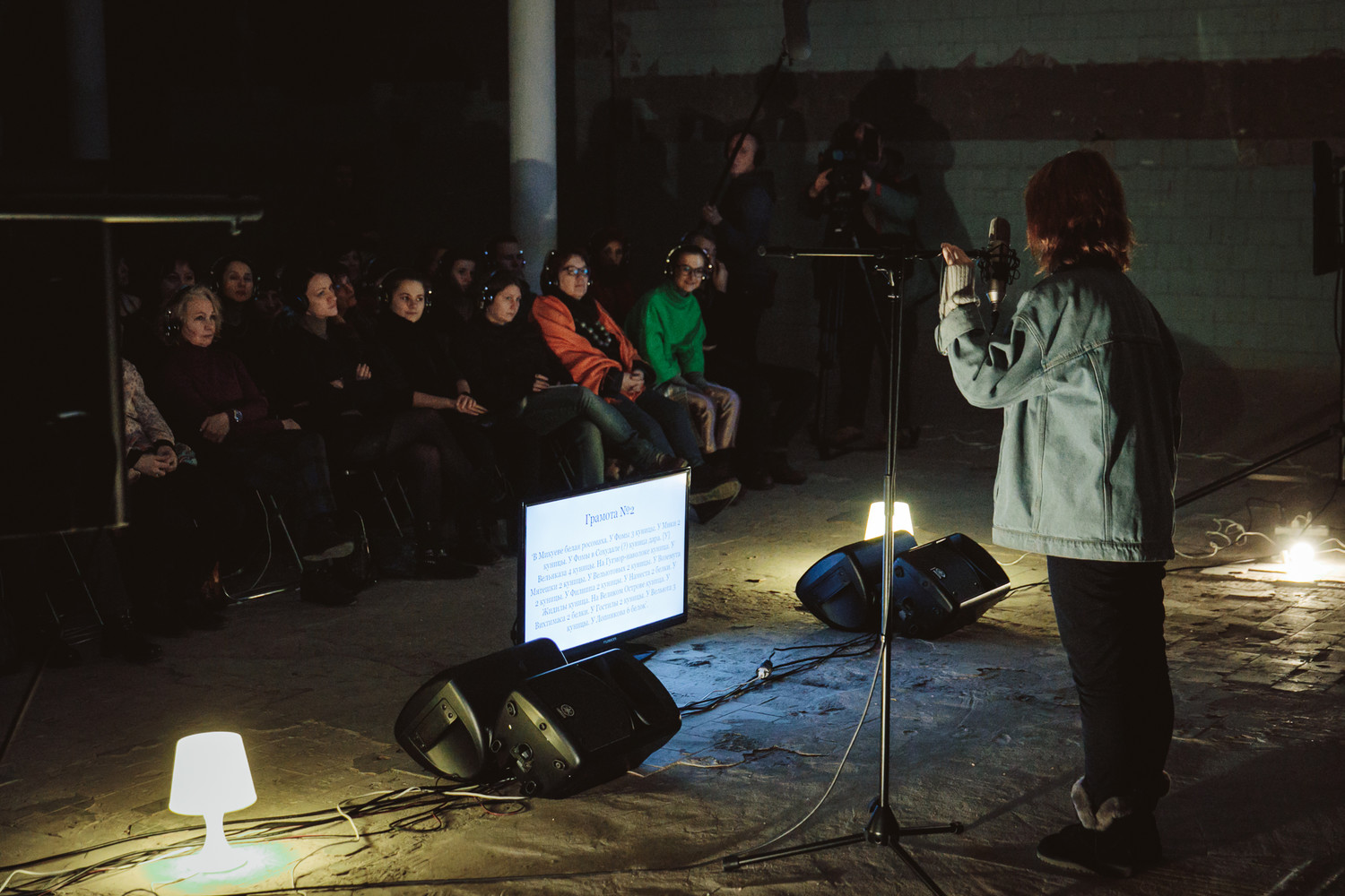 Декабрьская премьера театра post случилась в катакомбах Петрикирхе, лютеранской церкви Петра и Павла в Петербурге. «Грамоты» отчасти продолжают тему «Художника» – здесь снова быт далекого прошлого обращается в «духовные голоса». В «первом действии» (разбивка условна, весь спектакль длится чуть меньше часа) бóльшая часть зрителей сидит по одну сторону зала и слушает в наушниках рассказ о берестяных грамотах, памятниках древнерусской письменности. Тем временем 12 избранников (страшно рад, что попал в их число; впрочем, в театре post демократия, и при спуске в катакомбы вы сами решаете, принимать участие или остаться наблюдателем) занимают места по другую сторону и по очереди, следуя инструкциям на телемониторах, подходят к микрофону, чтобы прочесть тексты первых 24-х грамот. В которых – про суды, посевы, домашнее хозяйство и прочую повседневность IX века; иногда перевода и вовсе нет – часть древнерусских «каляк-маляк» расшифровке не поддалась.