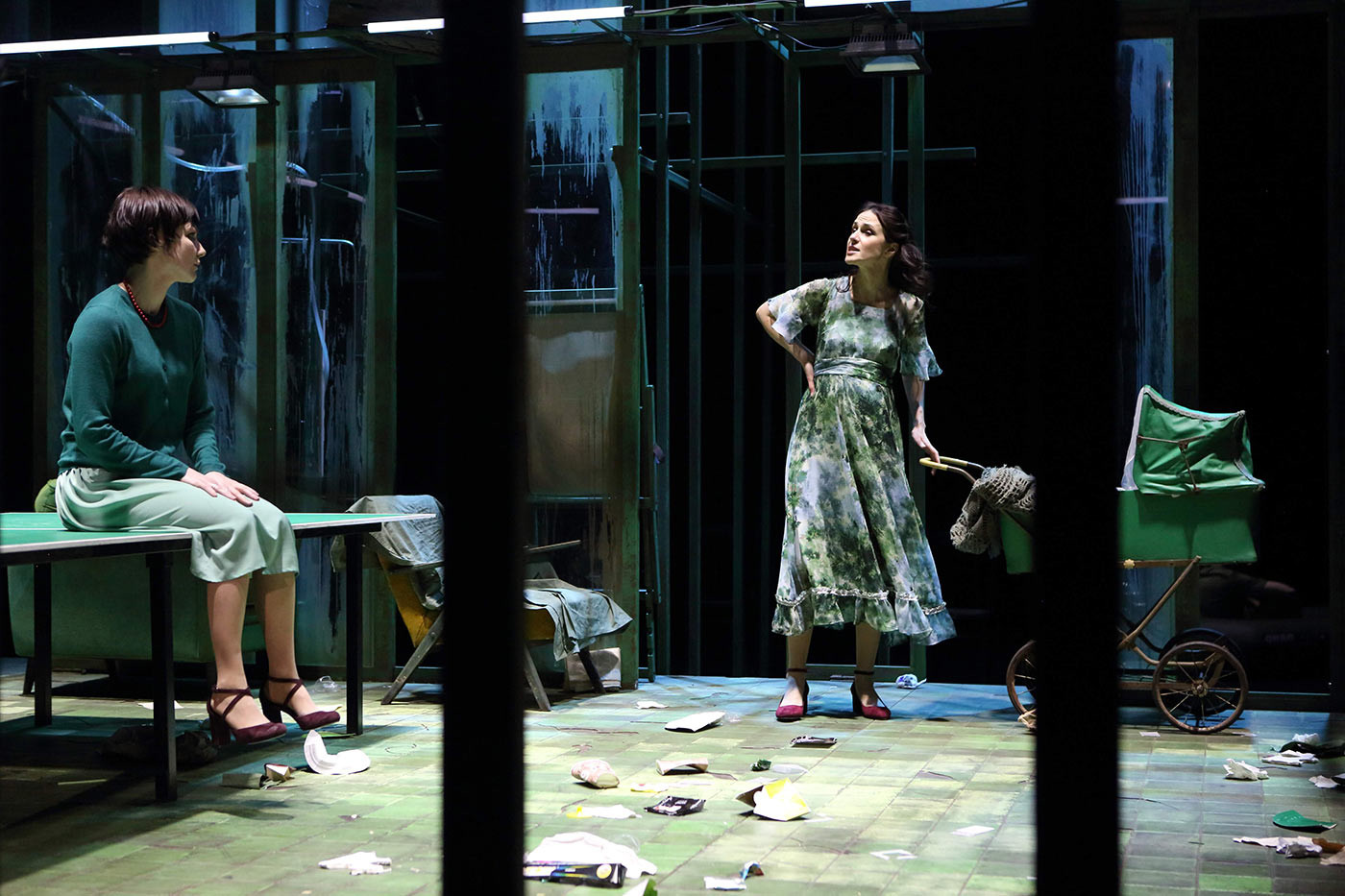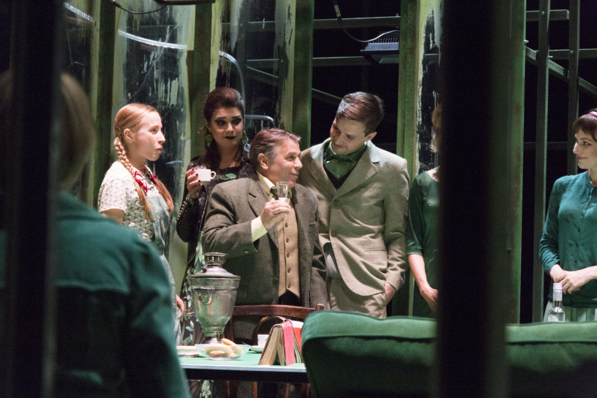 «Дачники» начинаются с «Кузнечиков», стихотворения Арсения Тарковского – и это напоминает о «Чуде со щеглом», лучшем спектакле Огарёва в «Школе драматического искусства». Продолжаются зеленью долго пустовавшего дачного дома: сукно теннисного стола, где вместо разделительной сетки – стопки книги, патина, кафель на полу; даже в одежде каждого персонажа есть что-то зеленое.