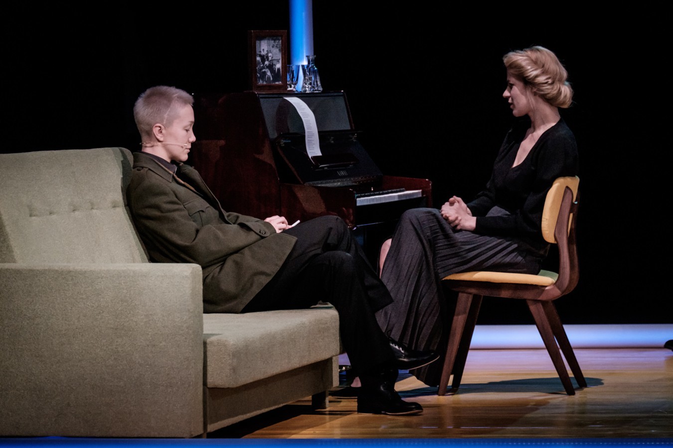 Осенью в фойе Камерного, где каждый месяц-полтора – новый арт-проект, прошла выставка «Актрисы Камерного театра. От Береники-Шевченко до Антигоны-Бабенковой: 25 лет истории театра». Здесь и правда всегда работали и продолжают работать красивейшие актрисы. В «Афродите» рассказ идёт от лица фронтовика Назара Фомина (и его отлично играют сразу три актера разных поколений – Андрей Новиков, работающий в Камерном со дня основания, Владислав Моргунов и совсем юный Георгий Яковлев, для которого первым спектаклем в Камерном стали «Одноклассники»). Но это – женский спектакль, пусть у символических Веры-Надежды-Любви – Яны Кузиной, Марины Погорельцевой и Людмилы Гуськовой – в инсценировке слов нет. Кое-что невозможно пересказать словами – даже словами Платонова.