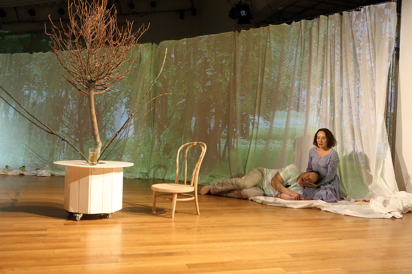 Последняя премьера 2018-го – короткий спектакль по автобиографическому рассказу Андрея Платонова, о войне и любви, с мифологическими мотивами, пеплом и яблоками, тремя грациями, будто сошедшими с картин Ботичелли, и казарменным неуютом.