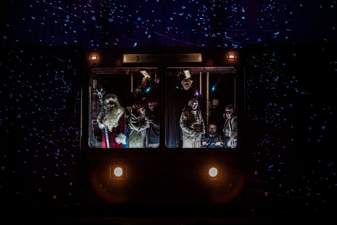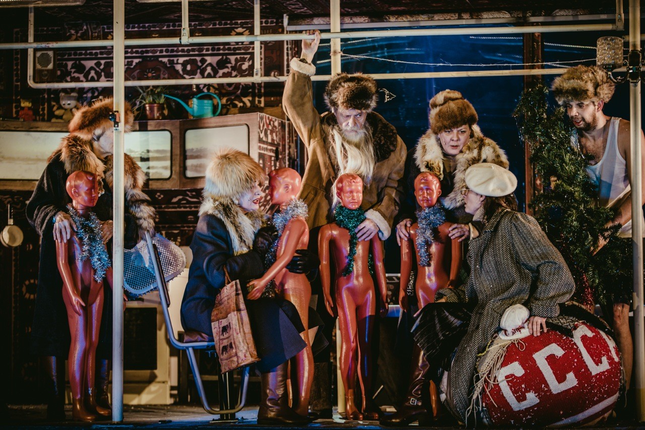 Новый год – универсальный национальный праздник; одна из святынь современого россиянина; один из ключевых образов спектакля, рифмующего новогодние гирлянды и похоронные венки.