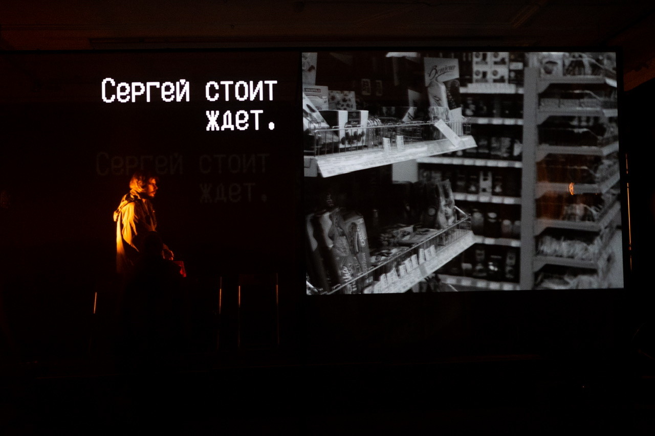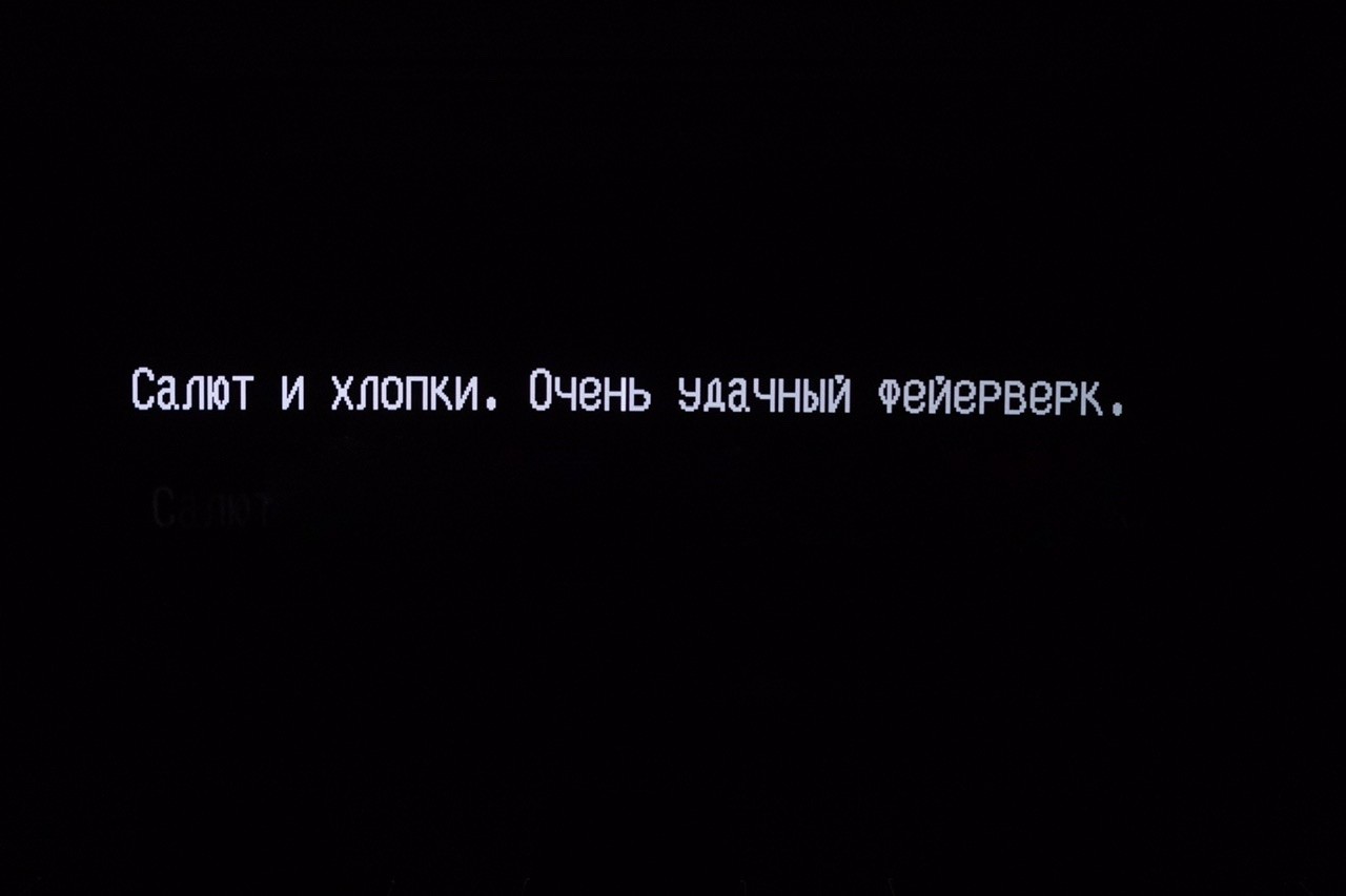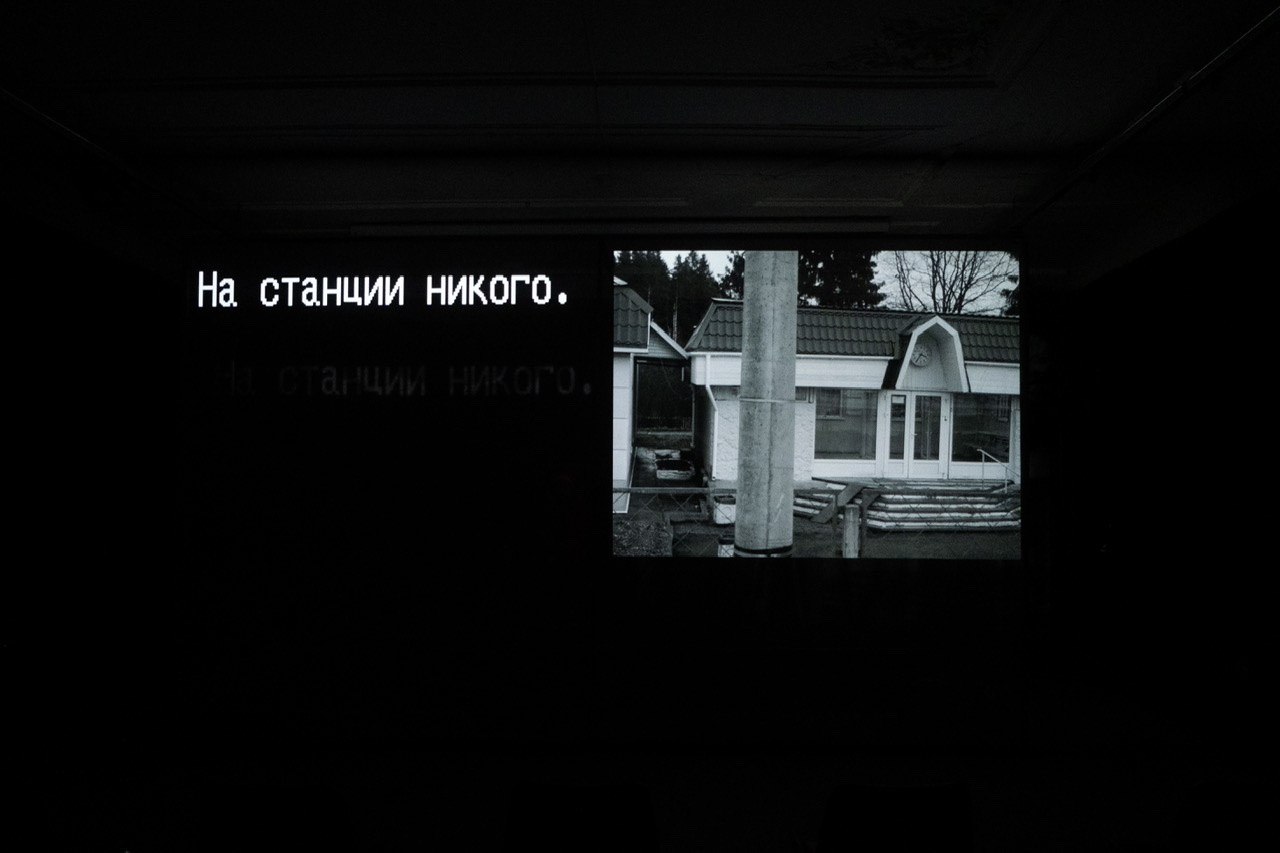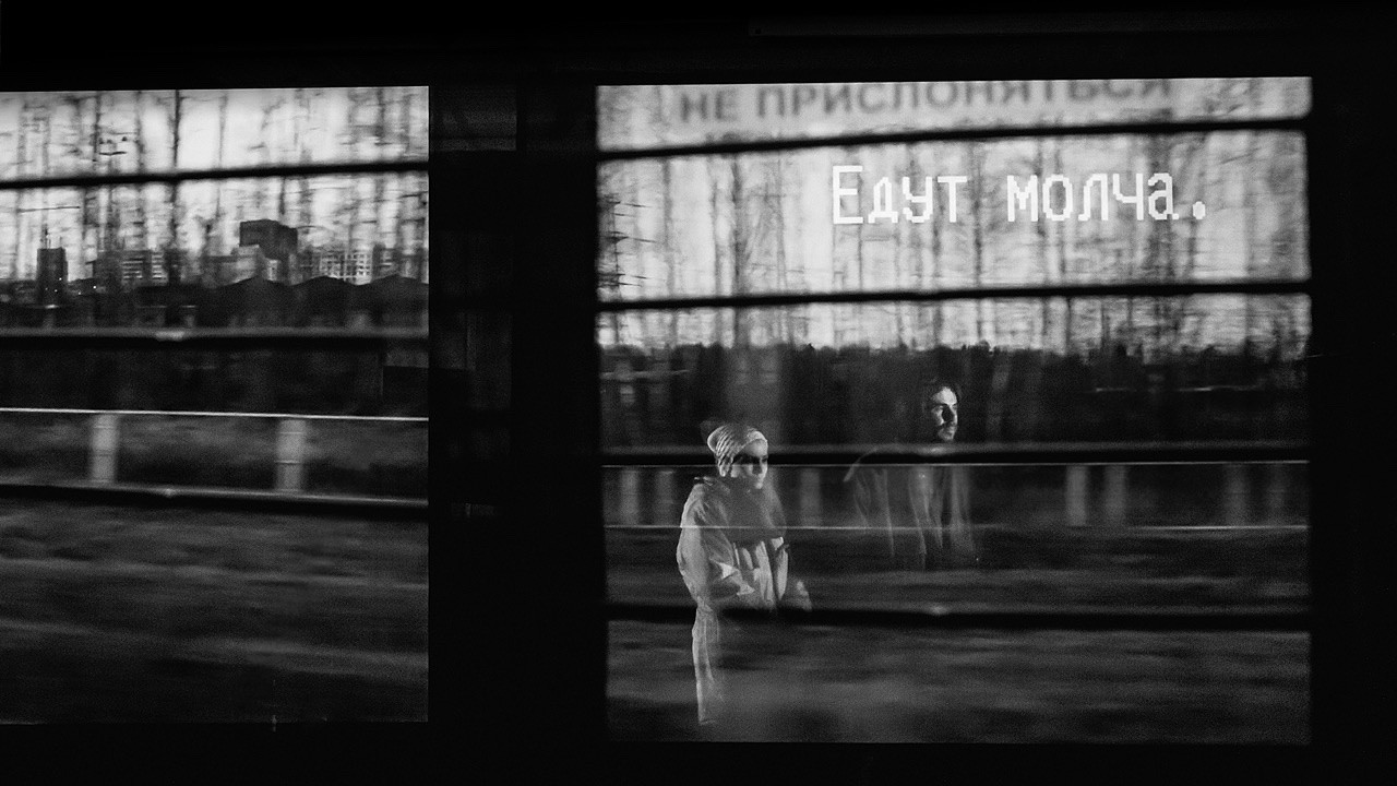 Что ж, взять пример с Серёжи и «не поддержать разговор», можно в любой момент – соседи так и поступили, сбежав на середине. Можно к просмотру заранее подготовиться – посмотреть на youtube запись читки «Комитета» самим Волкостреловым и Инной Сухорецкой на «Любимовке-2019» или прочесть пьесу. Авторских ремарок в ней больше, чем диалогов, избранные Волкострелов спроецирует на экран, но кажется лишь для того, чтобы запутать ещё сильнее. Герои едут в электричке под титр «Мир скользит в сторону обратную ходу движения машины»; хоть на секунду, а задумаешься, откуда вдруг машина.
