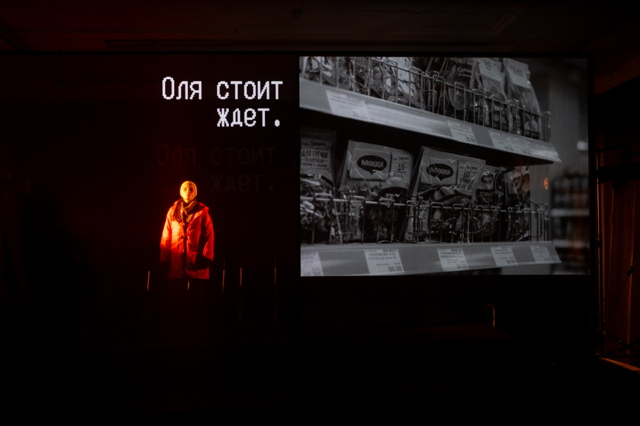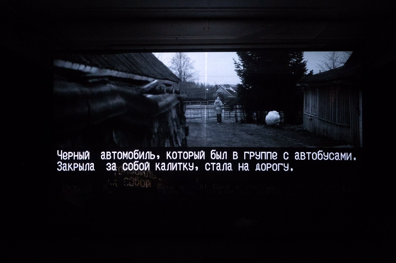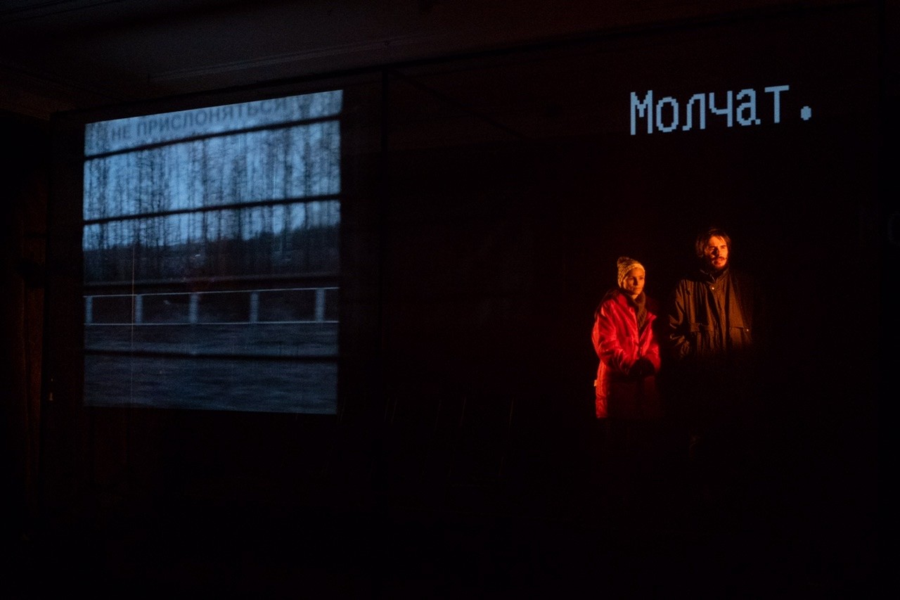 Что ж, взять пример с Серёжи и «не поддержать разговор», можно в любой момент – соседи так и поступили, сбежав на середине. Можно к просмотру заранее подготовиться – посмотреть на youtube запись читки «Комитета» самим Волкостреловым и Инной Сухорецкой на «Любимовке-2019» или прочесть пьесу. Авторских ремарок в ней больше, чем диалогов, избранные Волкострелов спроецирует на экран, но кажется лишь для того, чтобы запутать ещё сильнее. Герои едут в электричке под титр «Мир скользит в сторону обратную ходу движения машины»; хоть на секунду, а задумаешься, откуда вдруг машина.