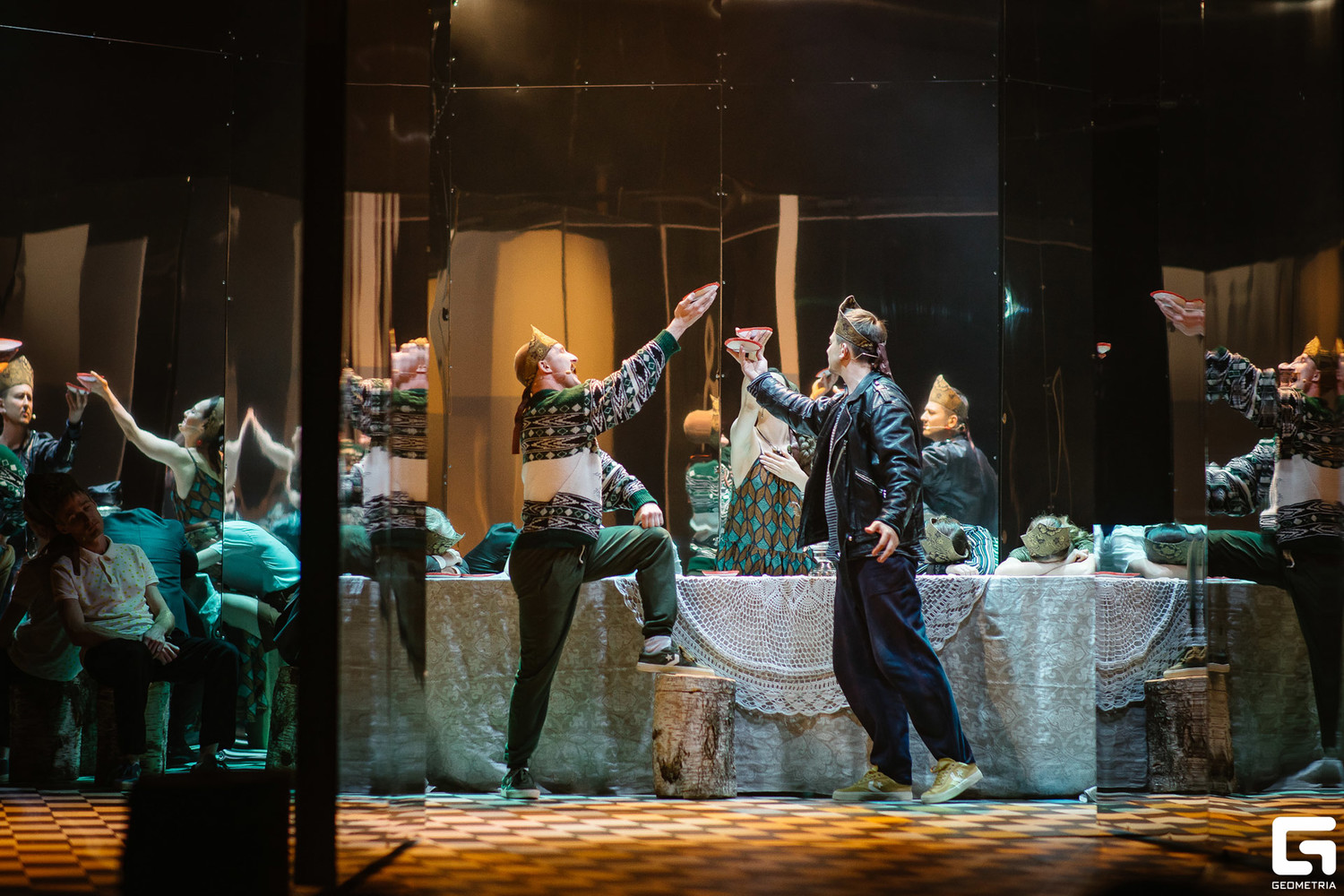На старте «Маска Плюс» показала две неортодоксальных версии классики, обе из СПб: «Ревизор» по Гоголю поставлен Андреем Сидельниковым в возглавляемом им театре «Суббота», «Чайка» по Чехову поставлена Петром Шерешевским в возглавляемом им Камерном театре Малыщицкого. Два мира – два кефира, что тут ещё скажешь. Я не стану заявлять, что ничего хуже «субботнего» «Ревизора» я не видел; всякое бывало. И несколько забавных гэгов в спектакле есть: вот в начале, например, когда современные чиновники стекаются на собрание к губернатору, под пресс-волл с надписью «Гоголь Ревизор», со «Святым источником» на столах и шредером для уничтожения компромата, секретарь отбирает мобильные, а добавленный к действующим лицам персонаж – немка Инга Лазаревна – достаёт из сумочки телефонище с наборным кругом; нормально так пошутили, почти как Монти Пайтоны. Песня Шнурова – сон про то, что Москва сгорела – в принципе, в тему. Прочие шутки пожиже: конечно, помянут и санкции, и кору дуба с настойкой боярышника, и курение на расстоянии 15 метров; Добчинский и Бобчинский – ведущие телешоу «Эксклюзив с Петрами Иванычами», зарабатывающие рекламой белорусской сёмги, ну а Городничий со времён своей бандитской молодости не расстаётся с пистолетом (хотя сейчас же за это сажают, нет?). Образованность зрителей в «Субботе» не переоценивают: стоит всплыть слову «инкогнито», как секретарь поясняет его значение – «тайно». Непритязательная актуализация конфликтует с текстом, сохраняющим свой строй, но это обычная беда российского театра: на внешнее осовременивание смелости по сусекам наскребается, но вот переписать классику – упаси Бог. Малоосмысленные жесты – Петры Ивановичи, например, после переселения Хлестакова в дом губернатора надевают чёрные маски и сжигают официанта вместе с гостиницей – тоже из этого поверхностного евроремонта классики. В итоге нет ни подлинной, не шаржированной современности, ни Гоголя с его сарказмом и мистицизмом.