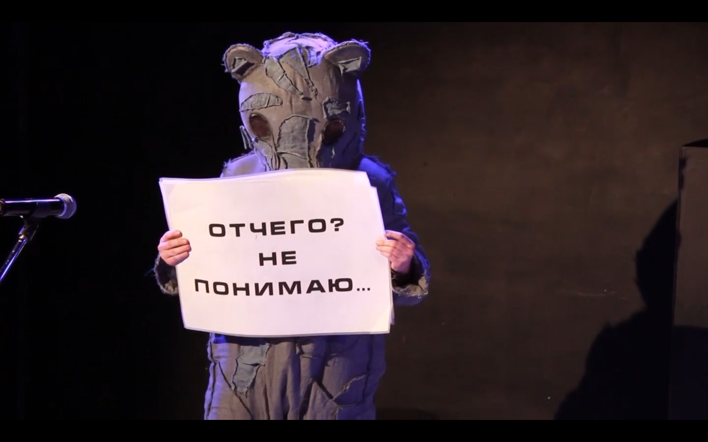 «Чайка» из Камерного театра Малыщицкого, «концерт для одного небольшого фортепиано и восьми маленьких», напротив, полна сюрреалистических странностей; моя любимая – это Медведенко, превратившийся в штопаного медведя и изъясняющийся с помощью текста, напечатанного на бумажных листах. Впрочем, разве не оправданная метаморфоза самого безропотного и жалкого героя пьесы?