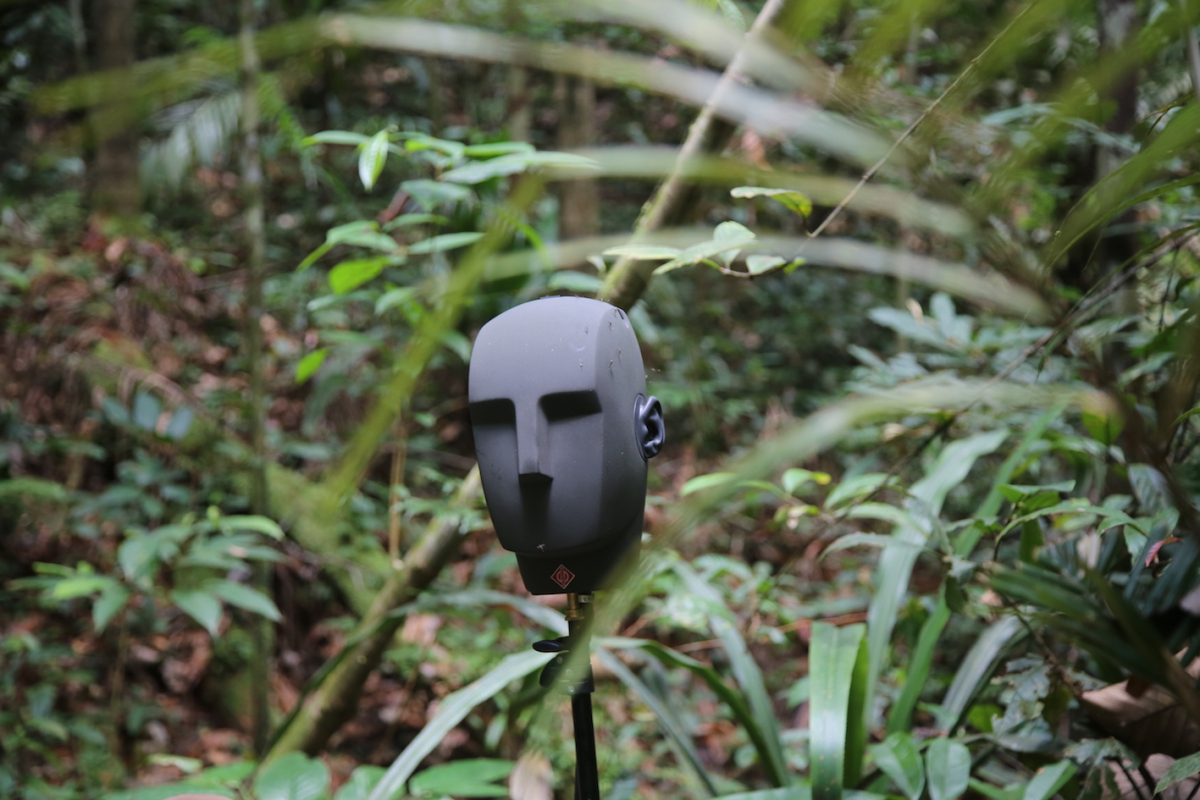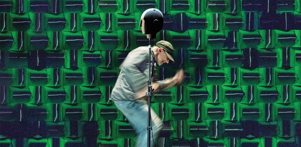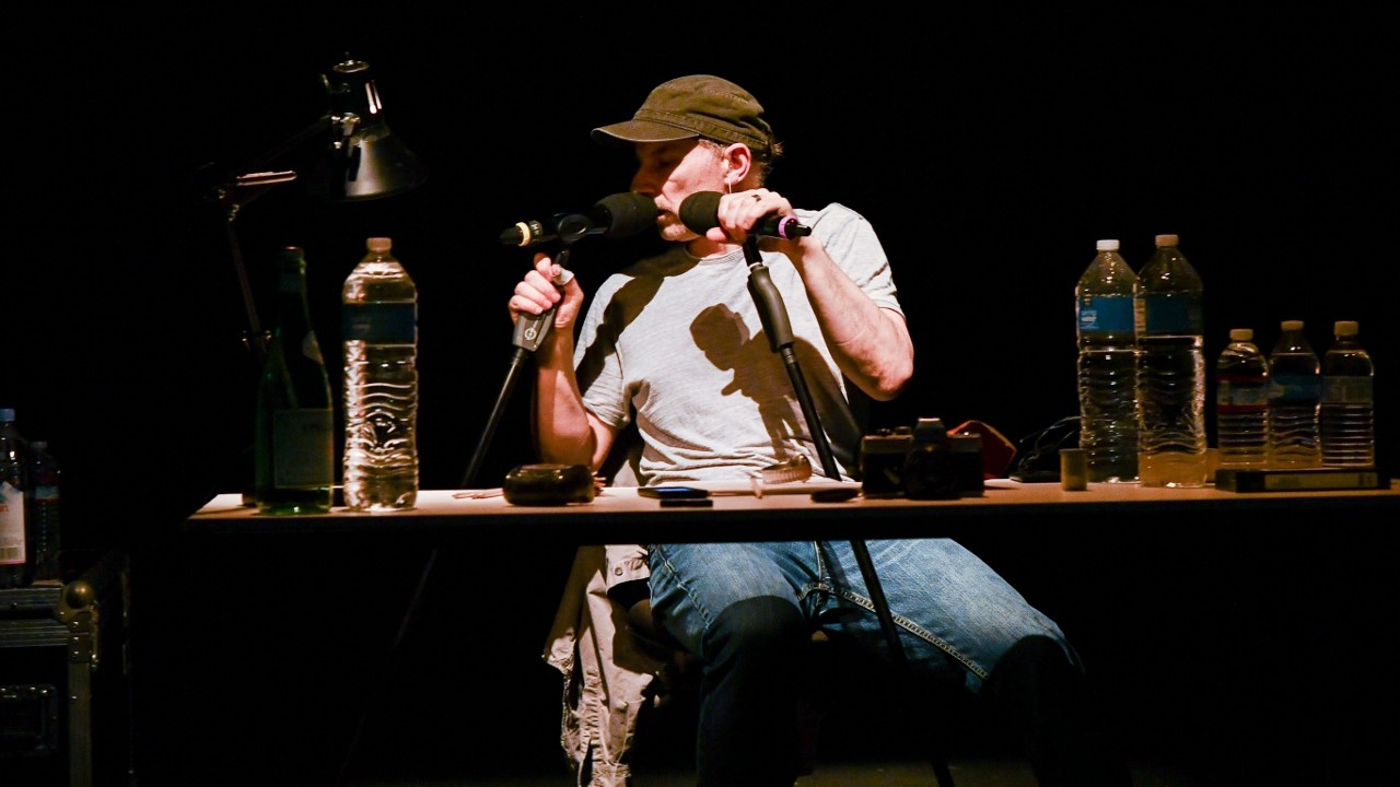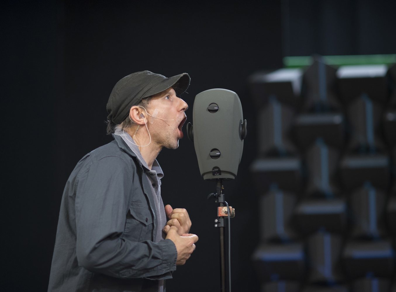 За кажущимся аскетизмом – на сцене всего один исполнитель в будничной одежде, это сам Саймон МакБерни, пара колонок, офисный стол и стул, бутылки с питьевой водой и, в центре, немного инопланетная голова, которая окажется особой бинауральной аудиосистемой, – сложные (и, подозреваю, недешевые) технологии, позволяющие не столько видеть, сколько слышать спектакль.