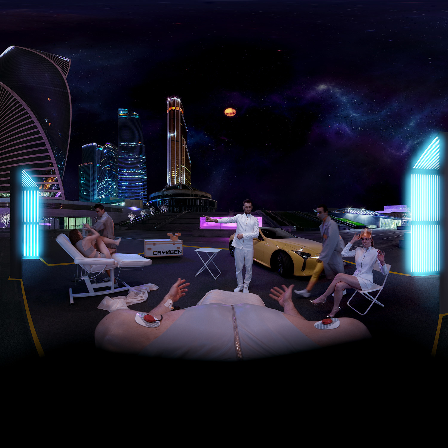 Тут ты действительно оказываешься внутри пространства (в «Клетке» это футуристически преображенная Площадь Сити, над которой грозно нависает Красная Планета), его можно рассмотреть, сделав полный круг на 360 градусов, и как бы скептически ты не был настроен заранее, реагируешь на рефлекторном уровне: вот сидишь ты на ступеньках и умом сознаешь, что рядом – твердая поверхность и твоя подруга Юля, но глазами видишь черную бездну, и невольно вздрагиваешь, и судорожно ищешь рукой опору. Это притом, что «Клетка с попугями» – фильм довольно статичный (правда, сравнивать мне не с чем, но, подозреваю, что в проектах с названиями «Эрмитаж», «Эльбрус», «Ленком» или «Вулканы» у зрителя большая «свобода передвижений», а про Иньярриту рассказывают, что даже в тело героя можно заглянуть и увидеть, как бьется сердце). Герой-зритель, как я уже сказал, обездвижен испытательным (пыточным?) креслом, главный герой, собственно, фильма (его играет Риналь Мухаметов) – ученый с эксцентричными повадками, то ли исследователь, то ли психопат.