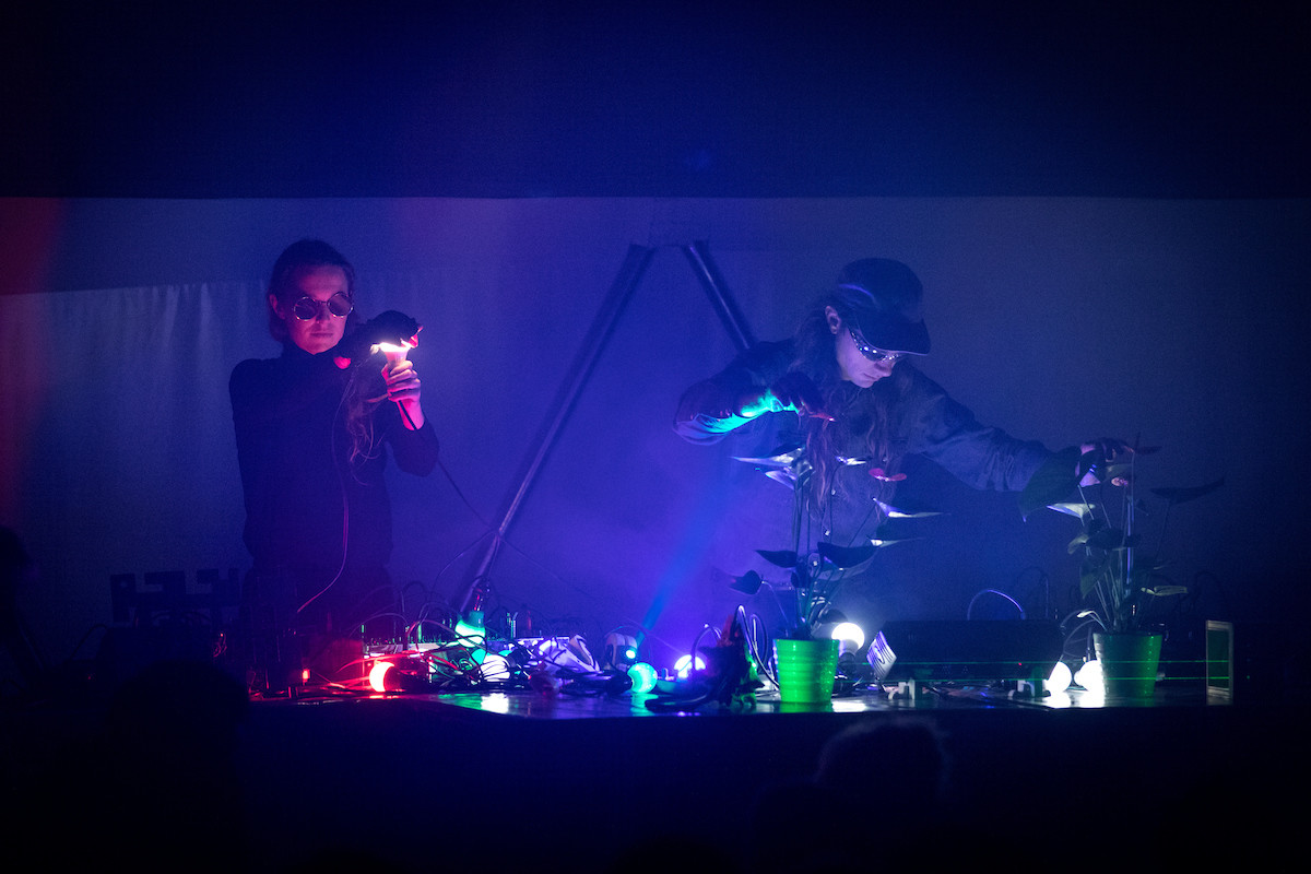 Американский дуэт Берча Купера и Бренны Мерфи, выступающий под именем MSHR в работе Embedded Figure Array обходится без проекции, видеоэффекты ограничиваются световыми вспышками (напрямую связанными с саундом), но магия, опять же, рождается из технологий: MSHR извлекают божественный нойз из хитрых электронных аппаратов собственного изготовления;