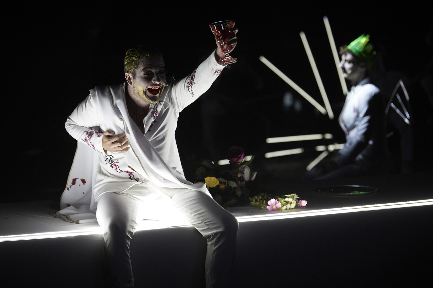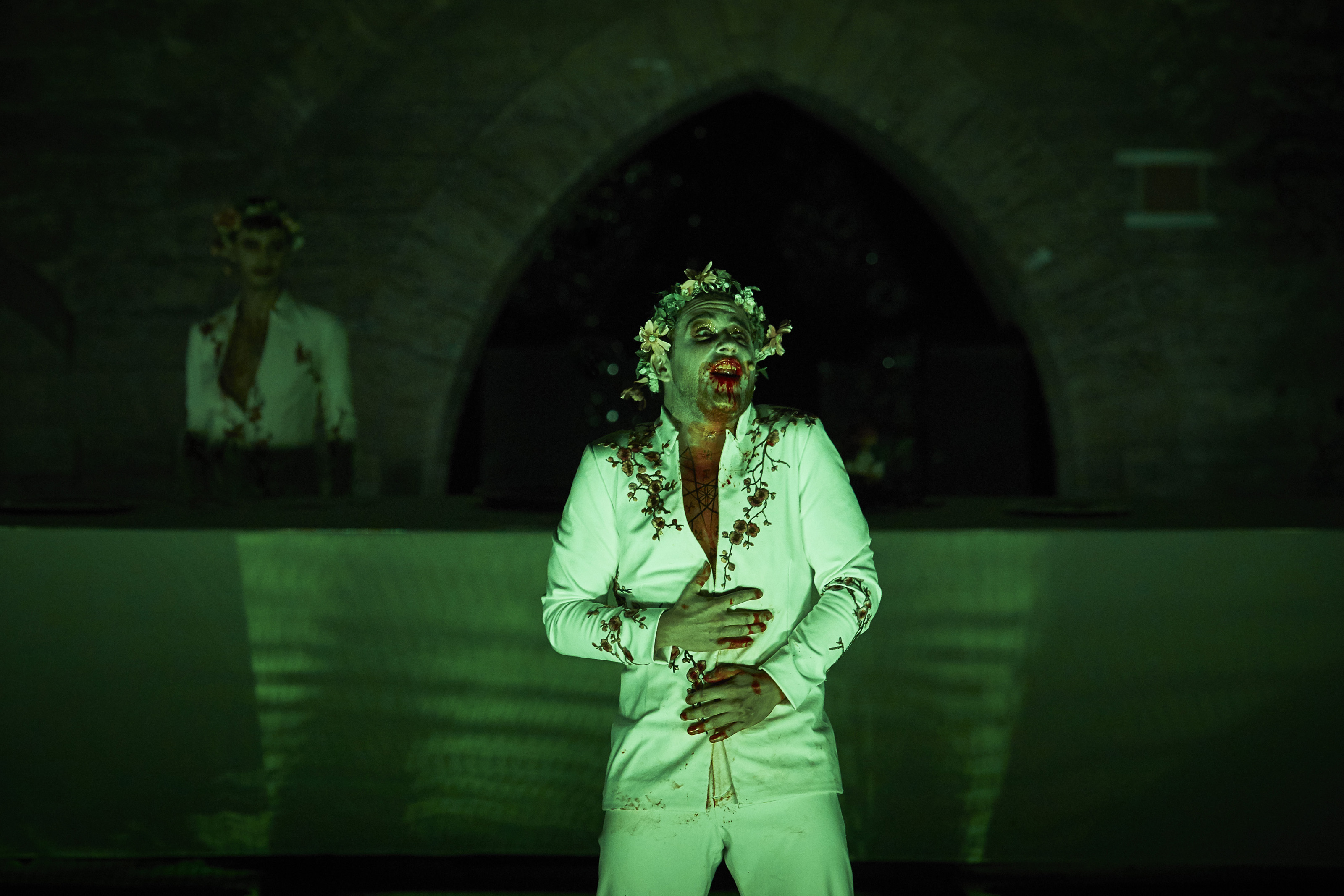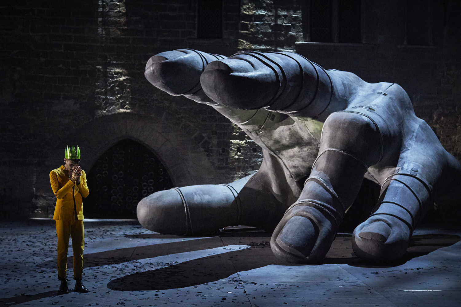 На сцене, погружающейся в ночную тьму вместе с городом, – поверженный идол (в сценографии Жолли и Кристель Лефевр – и малость обычного человека, и гибель богов, и крах империй, и неумолимое течение времени, и закат театра – не останки ли это Мельпомены?). Слепец в белом («роль» отдана одному из музыкантов; часть оригинального саундтрека Клемана Мирге вживую исполняется струнным квартетом) медленно шествует из-под исполинской длани к застывшей в крике ужаса голове. Этим молчаливым прологом Жолли – как Сенека, который писал трагедии, рассчитывая на изначальное знание мифа своими потенциальными зрителями-слушателями – запускает мириады ассоциаций (Эдип, рок, расплата – самые поверхностные) со всей трагической мифологией разом. И экспрессивно дополняет их уже иной мифологией: фурии, устраивающие салки, пожаловали прямиком из средневековых японских квайданов и новейших японских кинохорроров. А Тантал (дед Фиеста и Атрея, обреченный на муки за то, что испытывал терпение богов, пытаясь угостить их плотью своего убитого сына) выбирается на сцену из извергающей дым восьмиконечной звезды в полу весь в зеленой ряске – один в один болотная тварь из американских комиксов и b-movies 1960-х.