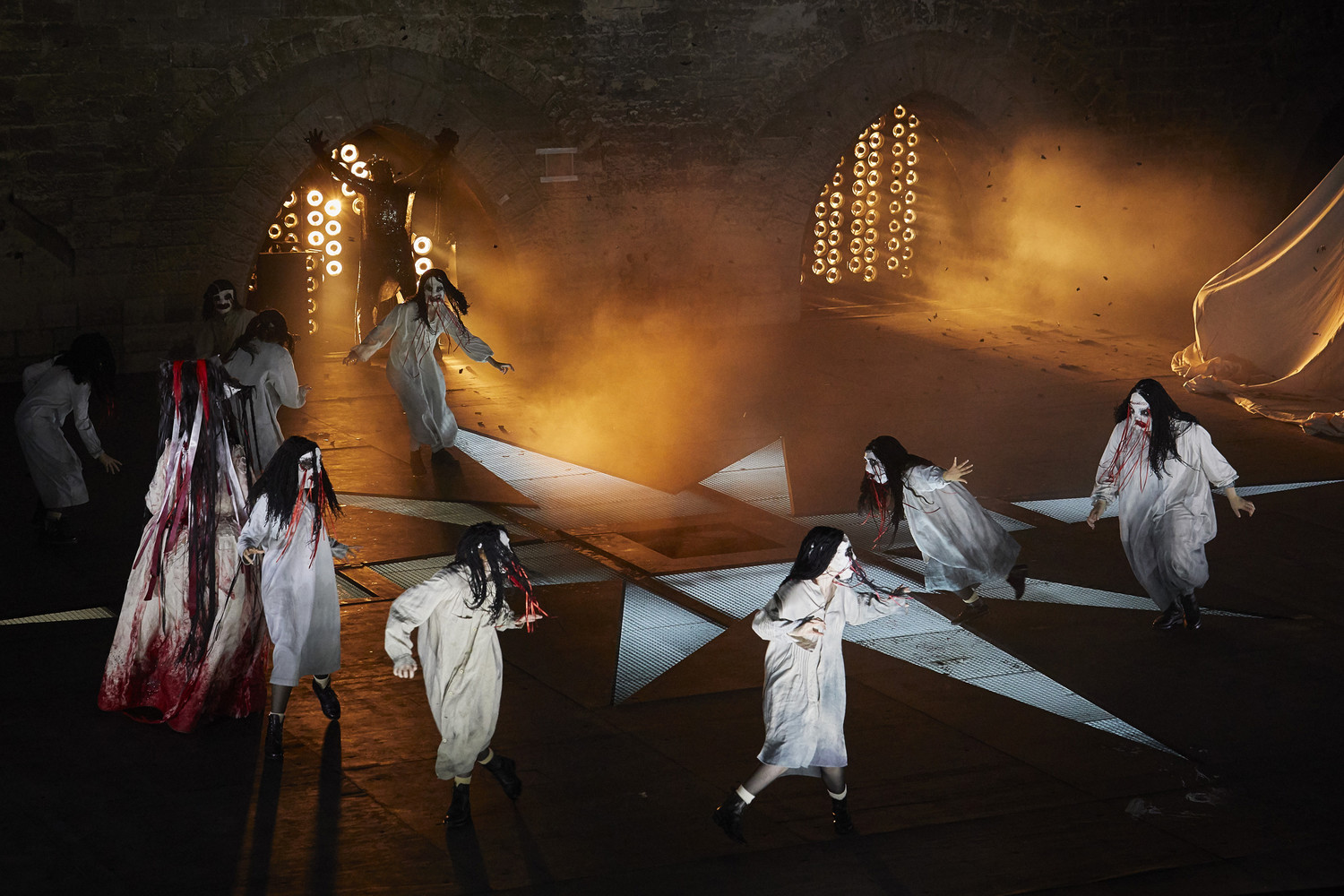 Свет – в самых разных проявлениях – сопровождает ударные моменты спектакля. Зловещее мигание окон на стене Папского дворца комментирует слова Фурии о котлах с человеческой плотью. Световой шторм венчает принятие Атреем рокового решения. Грозовые вспышки молний разрезают воздух в момент прозрения Фиеста. На игре со светом построена и самая сильная сцена этого шоу. Когда Вестник говорит о нарушении извечного череда небес – «ни заката нет, ни восхода нет» – авиньонская ночь меняется местами с днём: слепящий свет заливает весь зал. Затем – резкое погружение во тьму; риторическая эстафета переходит от Вестницы к Хору, и этот текст о катастрофе звучит уже не как техно, но как трагическая песнь, в очень красивом сопровождении детского хора (дети в уличной одежде делают сцену court d’honneur’а похожей на обычный городской двор). На стену проецируется слово «солнце» на всех человеческих языках.