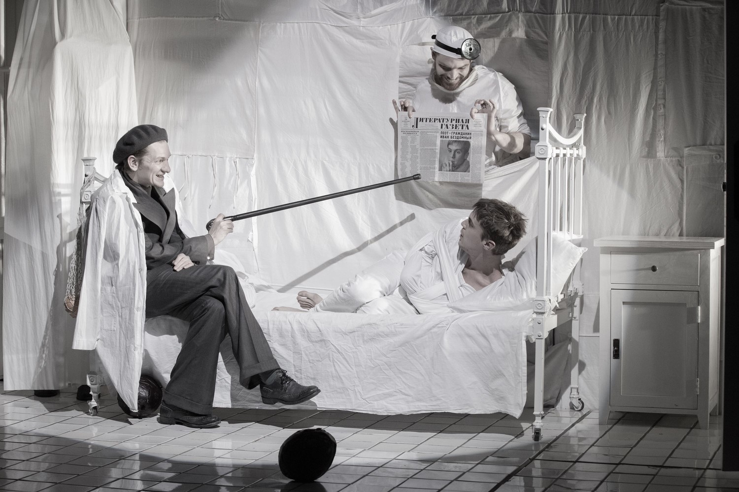 У Женовача, кстати, все, кроме мессира (он в этой постановке иной раз напоминает профессора Стравинского – всех вылечит), – в больничной спецодежде, и грань между санитарными халатами и смирительными рубашками почти неразличима; поди угадай, кто принимает твою одежду в гардеробе и продает программки – кандидаты в доктора или вырвавшиеся на волю психи.