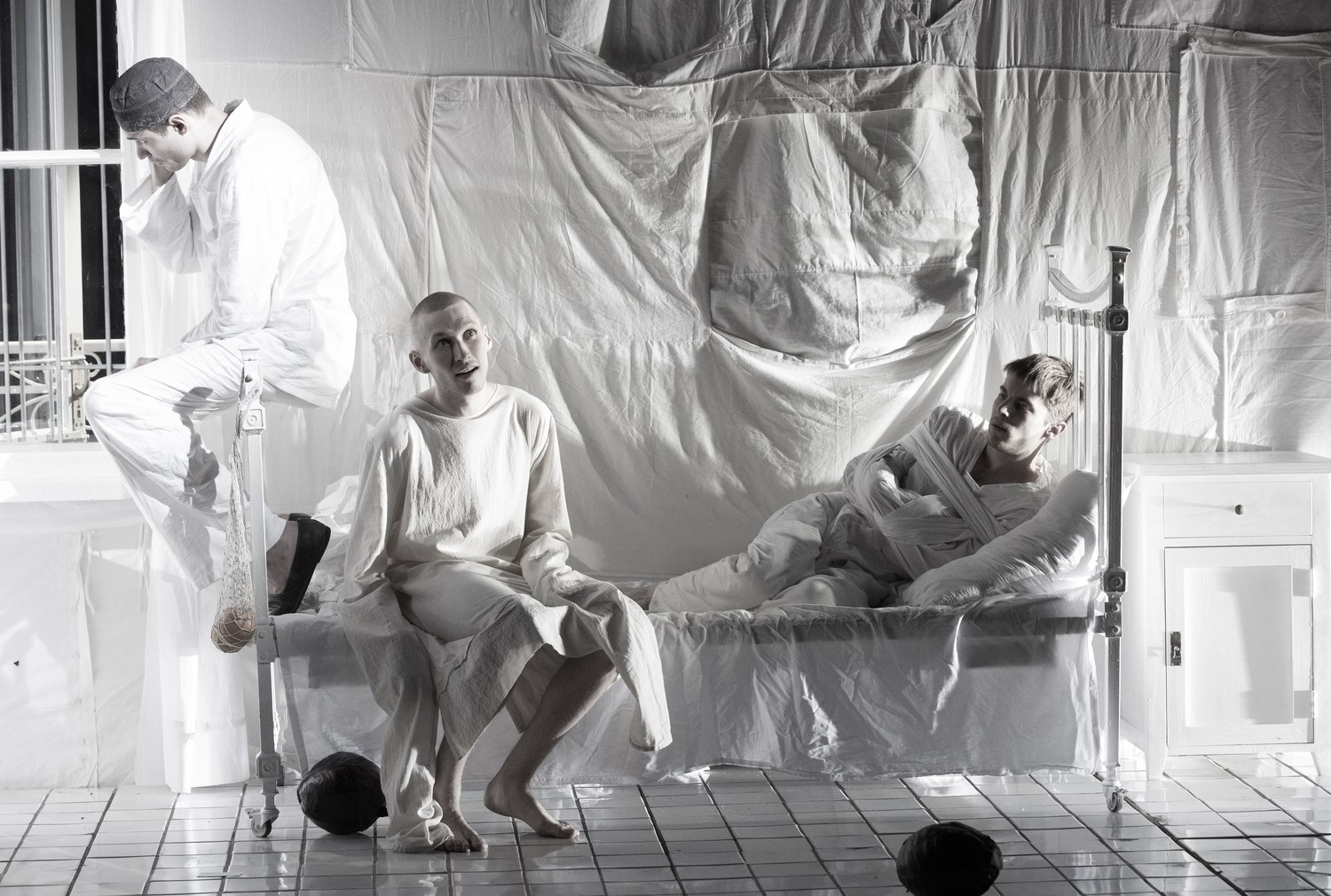 С пламени всё начинается: его языки вырываются из жерла письменного стола (большая часть действия вытеснена на узкую авансцену, в декорации солируют два предмета-полюса – писательский стол да кровать сумасшедшего дома), покуда нечистая сила озорно выглядывает-выпрыгивает из каждой щели. Пламенем всё заканчивается: во втором акте, уже после бала Сатаны, когда полыхает вся подпаленная воландовской братией Москва, даже одежда героев превращается в тлеющие лохмотья. Впрочем, спектакль, придуманый Женовачом вместе с постоянными соавторами, художником Александром Боровским и художником по свету Дамиром Исмагиловым, не изменяет принятой в СТИ приглушенной гамме; доминирует грязновато-белый, цвет сшитого из больничного белья задника и устилающей пол кафельной плитки.