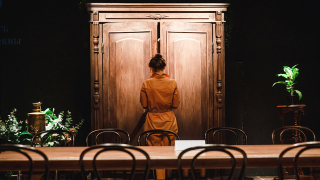 Оля и Серёжа в банке, магазине, электричке – «также как все, как все, как все». театр post играет пьесу про них в Мемориальном доме-музее Ф.И. Шаляпина, за прозрачным занавесом, превращающим чёткую картинку в сфумато; повседневная история молодой городской пары становится энигмой →