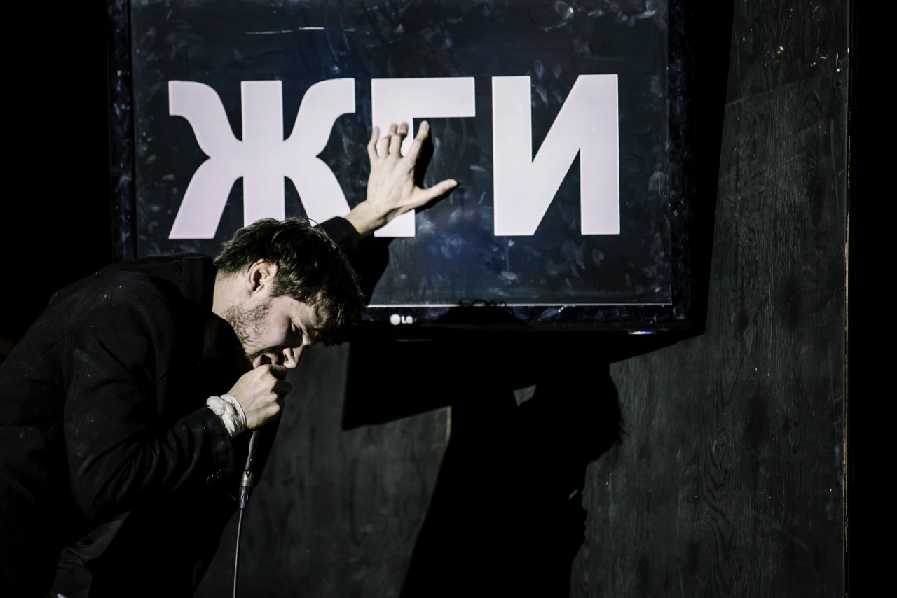 На буквальном переносе действия в наши дни крест ставит уже пролог, в котором оживает стихотворение Пушкина «Пророк». Контакт поэта (Филипп Авдеев) и шестикрылого серафима (Евгений Романцов или Артем Немов) – «и он мне грудь рассек мечом, / и средце трепетное вынул» – решен чуть ли не в стилистике body horror’a: раны, кровь, телесное страдание. Видеоэкран, который в спектакле становится практически самостоятельным исполнителем (часть текста не произносится, а проецируется), акцентирует слово «ЖГИ» – из адресованного поэту гласа бога: «глаголом жги сердца людей».
