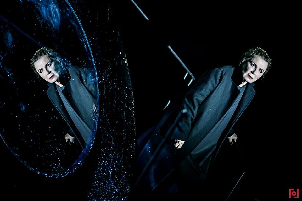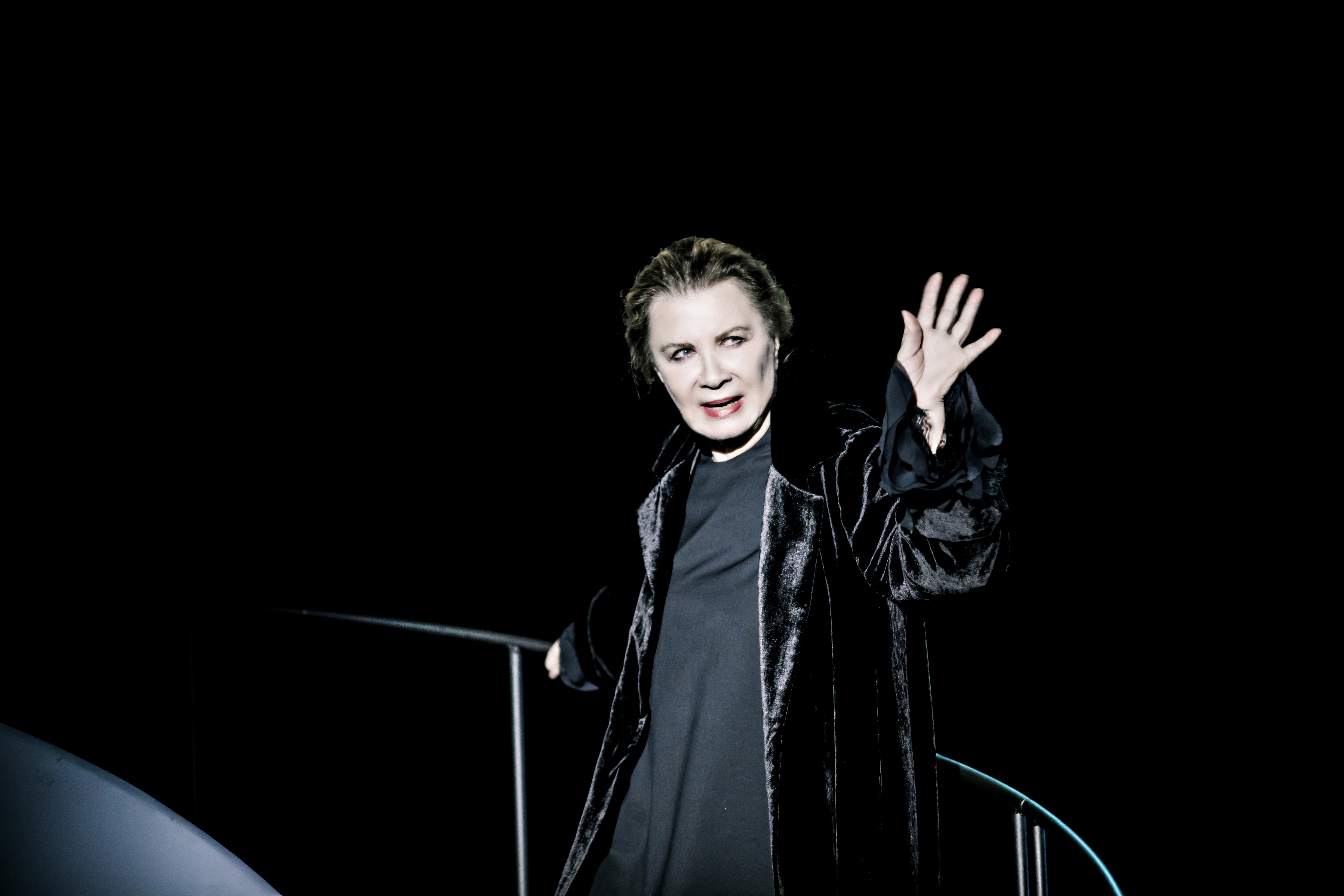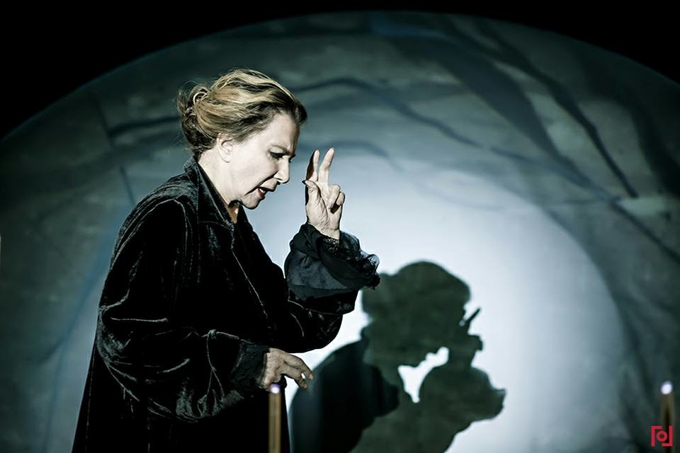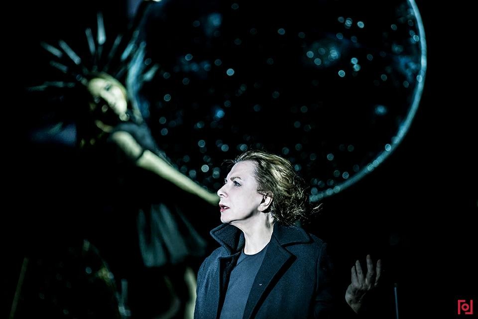 В спектакле есть моменты, когда театральная игра прямо вторгается на территорию поэзии – Светлана Мамрешева, например, превращается в Коломбину, о которой говорят Ахматова и Демидова: «Ты в Россию пришла ниоткуда, / О, моё белокурое чудо, / Коломбина десятых годов! / Что глядишь ты так смутно и зорко? / – Петербургская кукла, актерка, / Ты, один из моих двойников». Буквальный сценографический аналог – огромное черное зеркало – есть у слов о «зеркале страшной ночи». Фрагмент «А по набережной легендарной / Приближался не календарный – / Настоящий Двадцатый век» венчает агрессивный видеоколлаж с образами того самого века. Но образы, тени и фантомы из ахматовских стихов кажутся реальными и без внешних эффектов (визуально спектакль продолжает той буйный и трагический карнавал, стилистика которого есть во всех спектаклях Серебренникова, поставленных в 2016-м – от массивных, тяжелых высказываний в «Гоголь-центре» – «Машины Мюллер» и «Кафки» – до заразительно озорного и пенящегося весельем, но и с привкусом горечи тоже «Севильского цирюльника» в берлинской «Комише опер»). И когда Демидова начинает своё (и наше!) путешествие по «Поэме» – «Я зажгла заветные свечи / И вдовем с ко мне не пришедшим / Сорок первый встречаю год...» – нет нужды ни в свечах, ни в календаре, указующем на время действия.