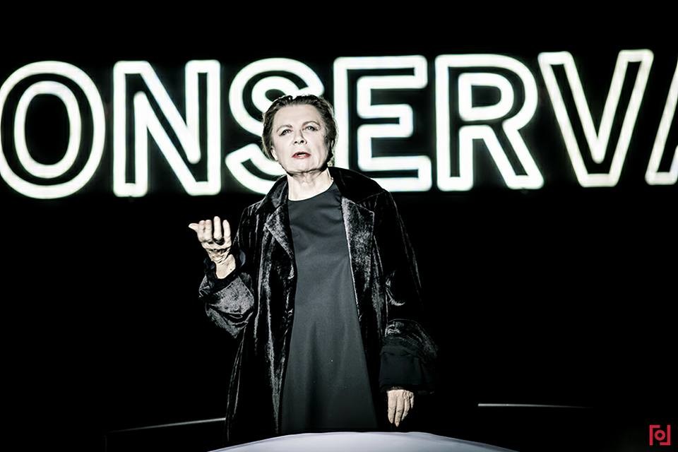 Демидова входит в темноту зала из зрительской двери и начинает с прозы: расшифровывает значение латинской фразы Deus conservat omnia, неоном горящей в высоте (кажется, впервые Серебренников использовал неноновую надпись – «Власть» – в первой из «чёрной серии» своих работ, «Околоноля») и пересказывает воспоминания Семёна Арановича (выдающегося советского кинорежиссера, документалиста, ставшего автором нескольких классических игровых картин, в частности, «Торпедоносцев» и «Противостояния»). Deus conservat omnia, «Бог сохраняет всё», девиз на гербе Фонтанного дома, открывающий текст «Поэмы без героя». Фраза, получающая в рассказе Демидовой неожиданную иллюстрацию: Аранович снимал похороны Ахматовой, чьё тело только четыре дня спустя после смерти (Анна Андреевна умерла 5 марта в подмосковном санатории, потом страна отмечала международный женский день, не до траура) было доставлено в Ленинград и предано земле на Комаровском кладбище. Проявленные пленки Аранович спрятал в сейф, откуда они спустя некоторое время исчезли, Уже в перестройку Демидова оказалась с гастролями в Монреале – читала, опять же, Ахматову. В гостиничном номере увидела телепередачу, где использовались те самые, вроде бы, бесследно исчезнувшие кадры – очевидно, ушлые западные телекомпании успели купить архив КГБ.