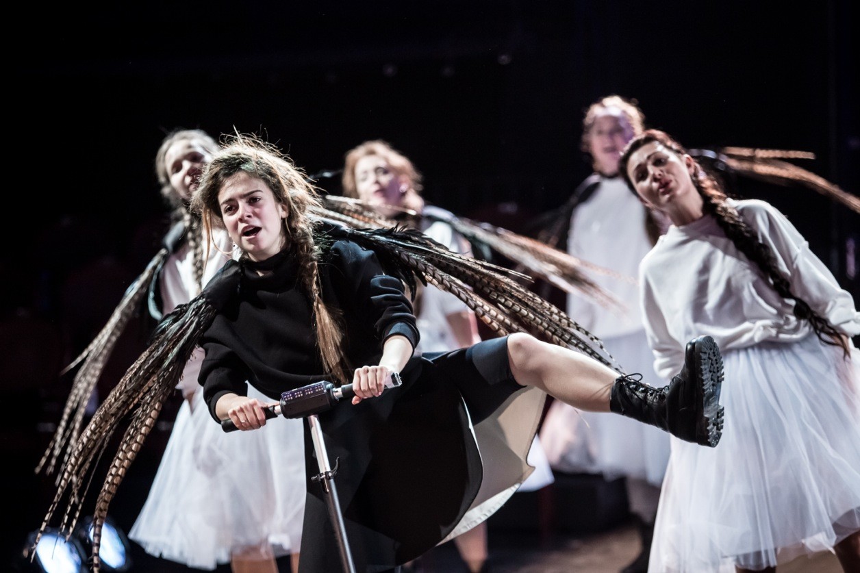 Радикальнее всего в спектакле – как раз пустое пространство, где основной элемент сценографии – экран, на который проецируются лица героев и бег русских рун. Мы-то представляем сказки по иллюстрациям Билибина да картинам Васнецова, а тут никаких живописных роскошеств, скорее, суровый стимпанк. В тексте панка нет, всё больше «Солнце-солнце, отвори оконце». До поры, конечно, это анти-Северянин (у которого «О России петь – что стремиться в храм по лесным горам, полевым коврам...»): пафос снижен, юмор усилен. Но на то матрица и русская, чтоб разразиться-таки к финалу взрывом духовности – про «Русь нежно спетую да нежно свитую» (Почти по-северянински: «О России петь, что утешить мать»).