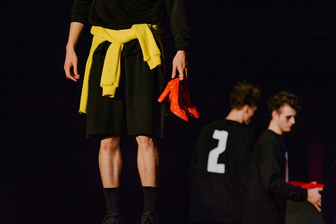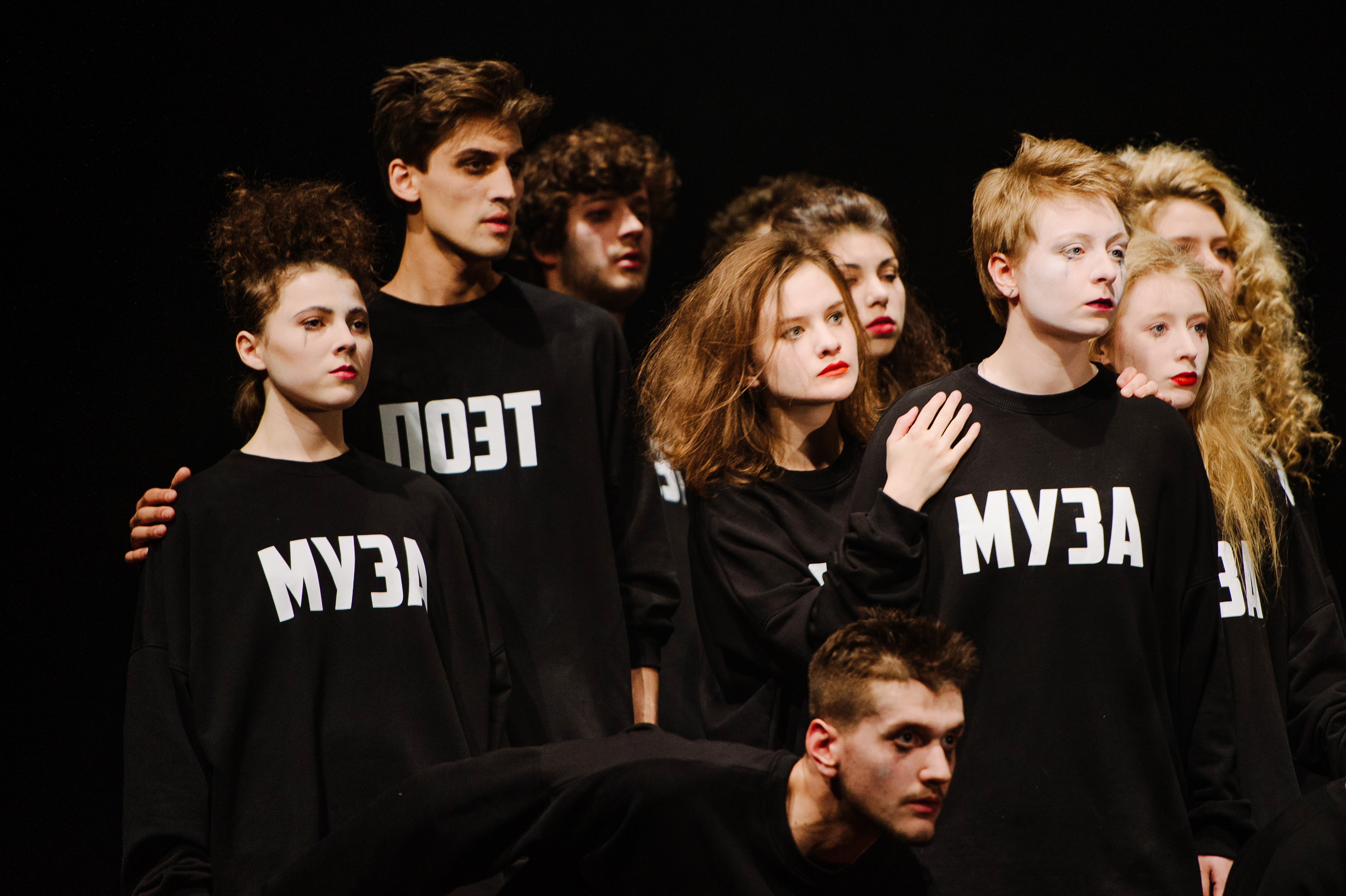 Поэтический карнавал продолжает «Не про это» – «фантазия-факт», дипломный спектакль студентов IV курса актерского факультета Школы-студии МХАТ, говоря проще, работа младших «брусникинцев». Сделана с режиссёром-педагогом Дмитрием Мелкиным (полтора года назад он выпускал с теми же студентами фольклорную open air оперу «Лес») по мотивам Маяковского – но не про него; фрагменты биографии, «письма, дневники, статьи», цитаты из Шкловского и Инессы Арманд проносятся здесь, как картинки в калейдоскопе.
