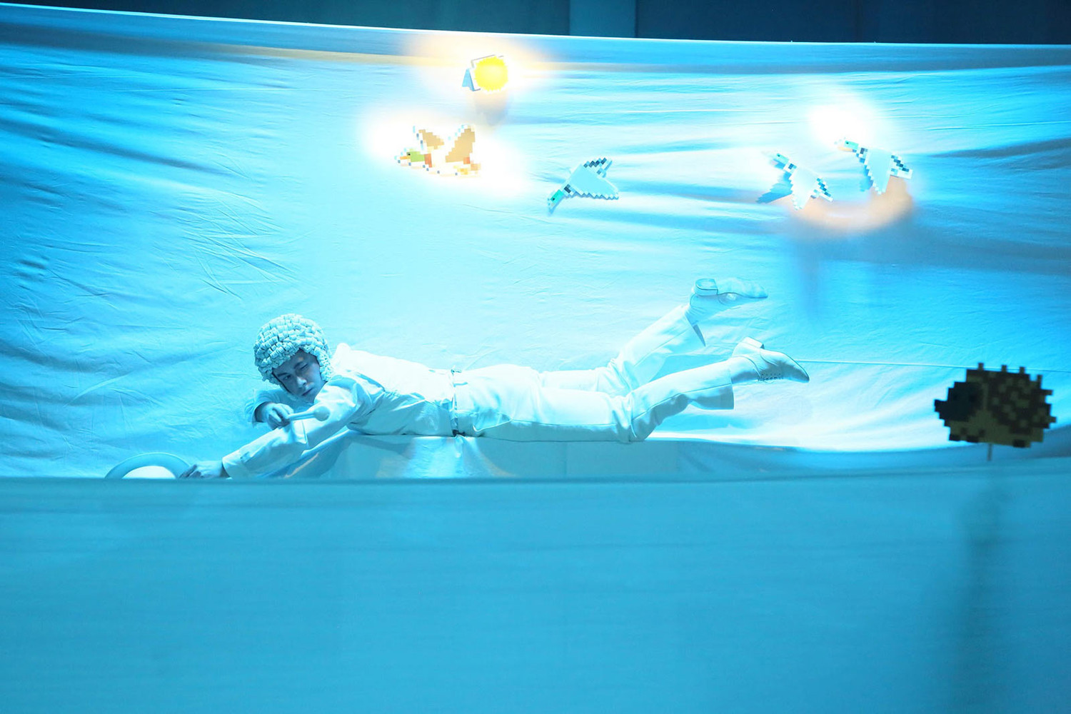 Странная старая кинохроника – об эксперименте над блохами, которых учёные вынудили смирить свою прыгучесть, – переходит в кадры синхронного плавания под сентиментальную мелодию; привет Первой программе Центрального телевидения. Проекция задаёт атмосферу: всё происходит здесь, но вряд ли сейчас, вне времени, в воображаемом мире, исполненном ностальгии (хотя почему плавание, скоро объяснится сюжетом пьесы).