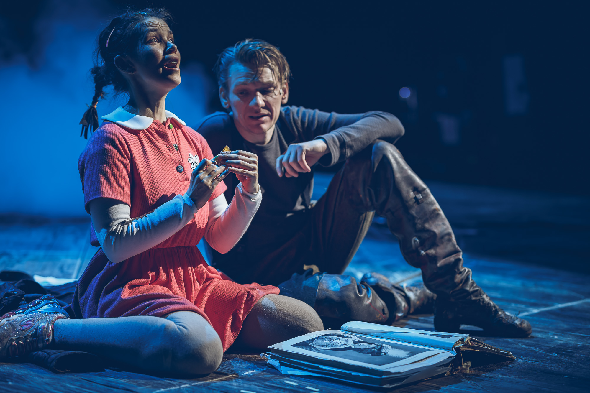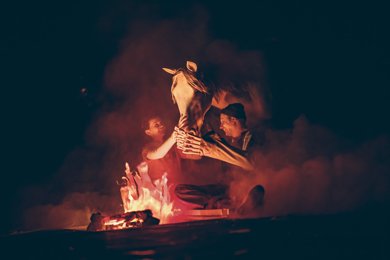 Вместо линейного сюжета – стремительный поток волшебных театральных превращений (оттого, что Охотник-Актер-Режиссер объясняет их старомодность скупостью бюджета, костер посреди сцены или звездное небо над ней не становятся менее волшебными; сценографияю и костюмы придумала Валентина Останькович, ученица Крымова, чьи работы прошли проверку уже и музейными залами). Череда комических (или трагикомических – на Руси всё рука об руку) гэгов. Обойма потешных дуракавалятельных диалогов (Му-Му же еще совсем маленькая, с речью, не правленной логопедом, наивная, по-детски беззастенчивая и делает миллион открытий – например, про то, что женщина из «Золотой Маски» и женщина из Театра Наций – это одна женщина. В смысле, директор фестиваля и театра Мария Ревякина).