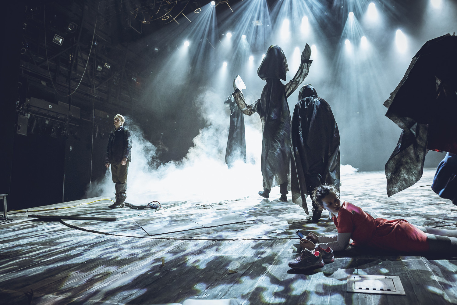 В углу сцены уже сидит ряжий детина, ест что-то принесённое с собой (наверняка, миновал кордоны суровой охраны Театра Наций какими-то тайными тропами) – это Герасим (Константин Муханов в очередь с Дмитрием Журавлевым), только не дворник, а монтировщик, чёрная косточка театра (и хрустит куриными косточками), гигант с накладной механической даже не рукой, а лапой. Таких не берут в главные герои – и здесь протагонист другой: тонкий, ломкий, благородный, в программке значится как Охотник, но на самом деле – Артист (как фонд, где соучредителем Евгений Миронов); и играет его приглашенная звезда – актер «Студии театрального искусства» Алексей Вертков, с ролями Венички и Воланда в послужном списке.