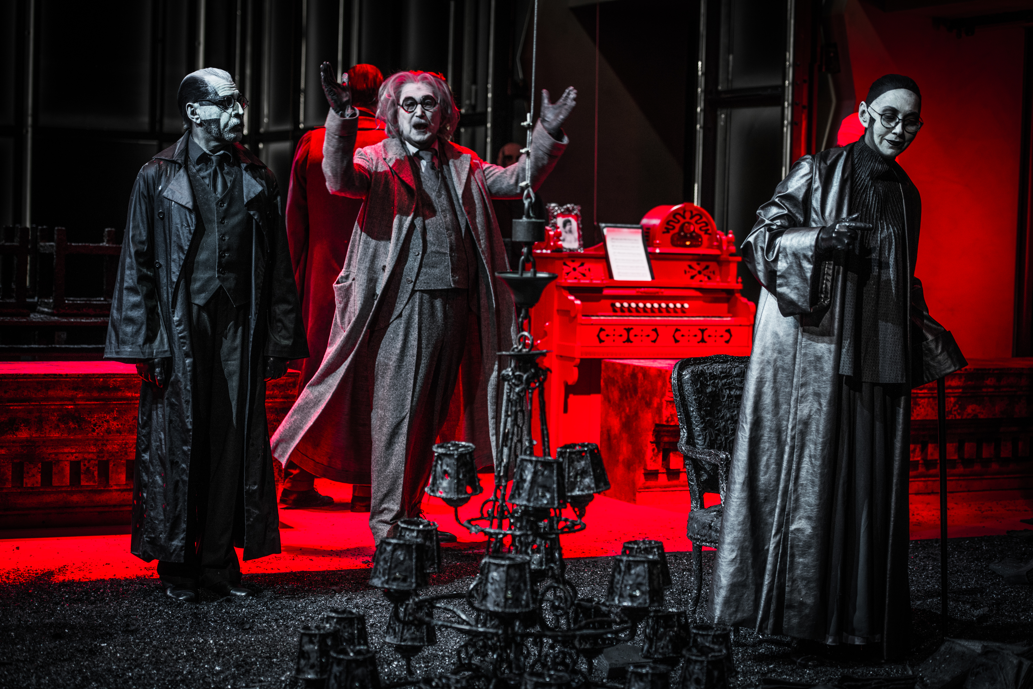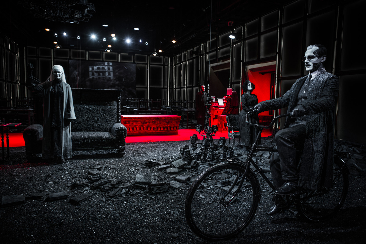 И, конечно, мир спектакля – мир готического романа, зловещий дом, где мерцают тусклым заупокойным светом разлапистые люстры, и пол застилает пепел. Оживший образ из романтического монолога тайного советника: «Когда меня озаряет райский свет, я вижу синее небо и тебя, Инкен, красные лилии и тебя, золотые звезды и тебя, голубые швейцарские озера и тебя, замок на высокой горе с зубцами и знаменами и в нем тебя, солнце и тебя, месяц и тебя. Но вот подкрадывается зловещая ночь, и появляется известный всем с детства дракон, который все это пожирает. Тогда я спускаюсь в мрачное подземелье Аримана, где пахнет горелым мясом и раскаленным железом. Там, внизу, я истекаю потом и кровью. Там, внизу, обитают привидения, подобные вампирам. Там, внизу, становятся вампирами те, что наверху были ангелами». Настоящий готический хоррор! Гипертрофированный, сгущенный, балансирующий на грани пародии. Но ни разу эту грань не переступающий.