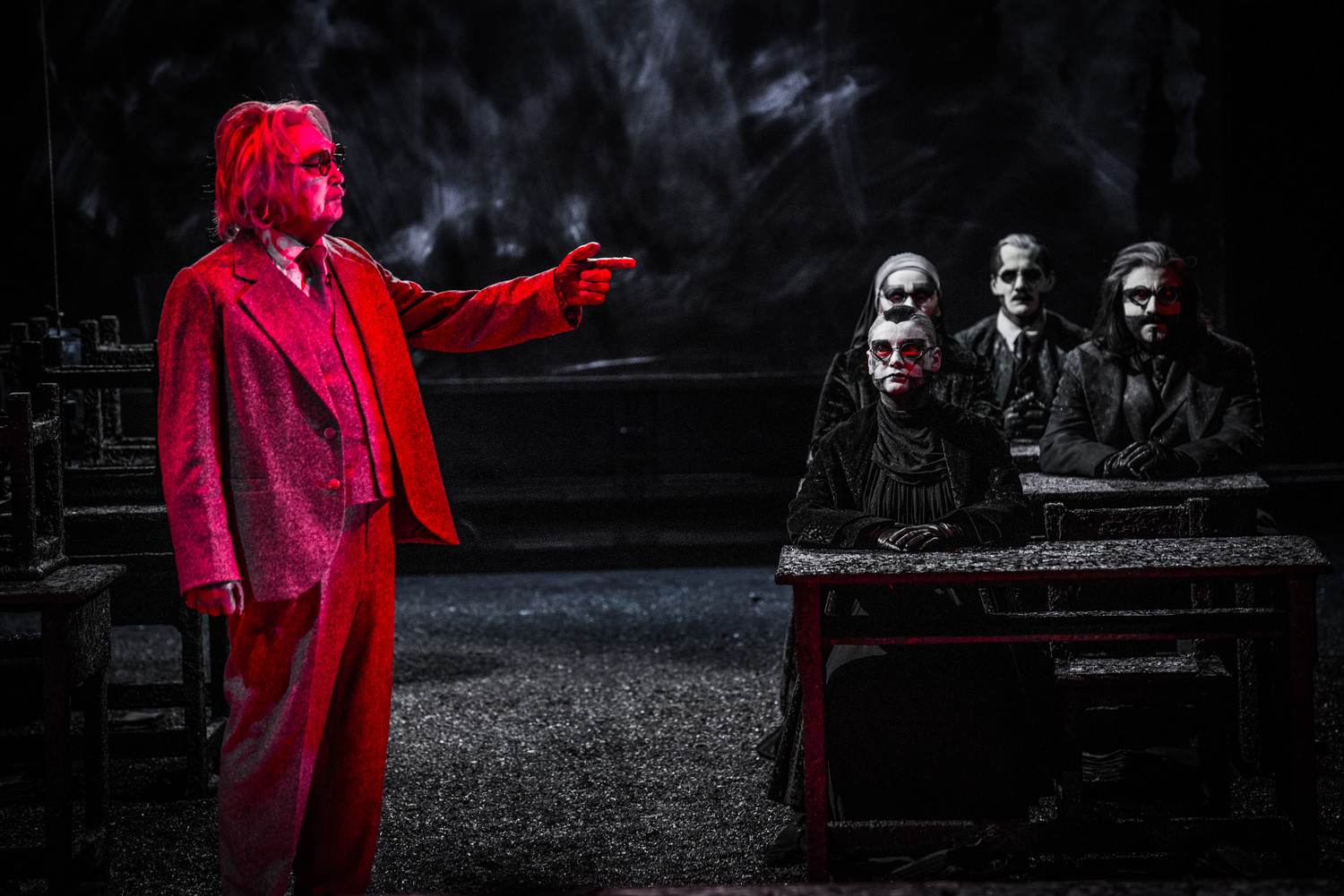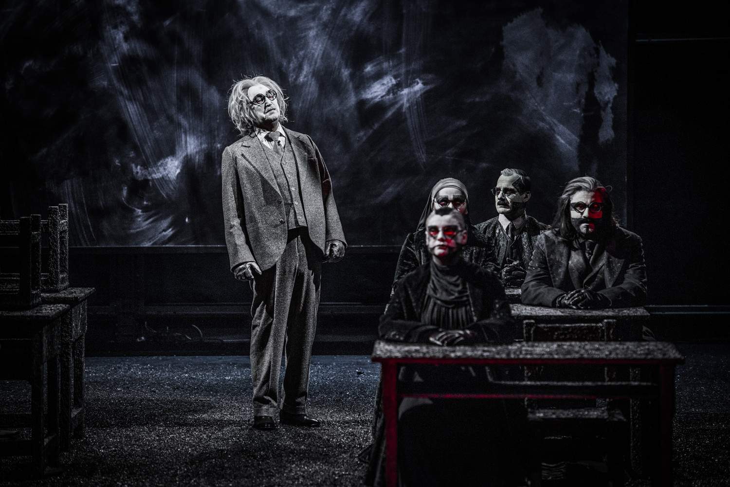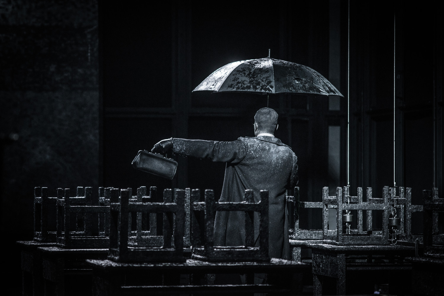Ряды смахивающих на парты столов с перевернутыми стульями определенно из той Германии, где тиранил школоту генрихманновский учитель Гнус. В скрежещущем электроникой саундтреке сквозь радиопомехи прорывается отрывистая немецкая речь. На заднике проступают – будто разводы мела на потусторонней школьной доске – неопределеные образы, кажущиеся кошмаром безумца с мунковского «Крика». Поле для ассоциаций безгранично – вплоть до стихотворения Константина Бальмонта, обожавшего Гауптмана: «Вороны вдруг прошумели, как туча, – и вмиг разразилась / гроза, / Словно внезапно раскрылись обрывы. / Выстрелы, крики, и вопли, и взрывы. / Где вы, друзья? / Странный бокал от себя оторвать не могу я, / и сказка моя / Держит меня, побледневшего, здесь – заалевшими / снами-цепями. / Мысли болят. Я, как призрак, застыл. / Двинуться, крикнуть – нет воли, нет сил. / Каркают вороны, каркают черные, каркают злые над / нами». Из странного бокала, наполненного сахарной водой с привкусом горького миндаля, примет смерть затравленный Клаузен.