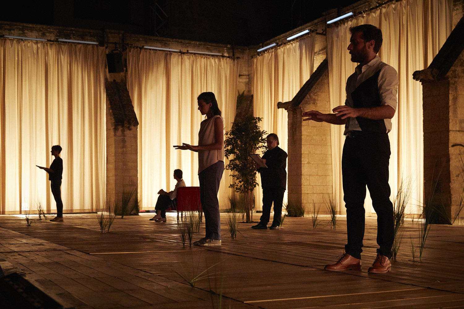 Дыхание театра материализуется у Родригеша еще до начала спектакля – в нежном колыхании на авиньонском ветру белых занавесей и будто растущей на камнях травы: пока безлюдное пространство уже живет.