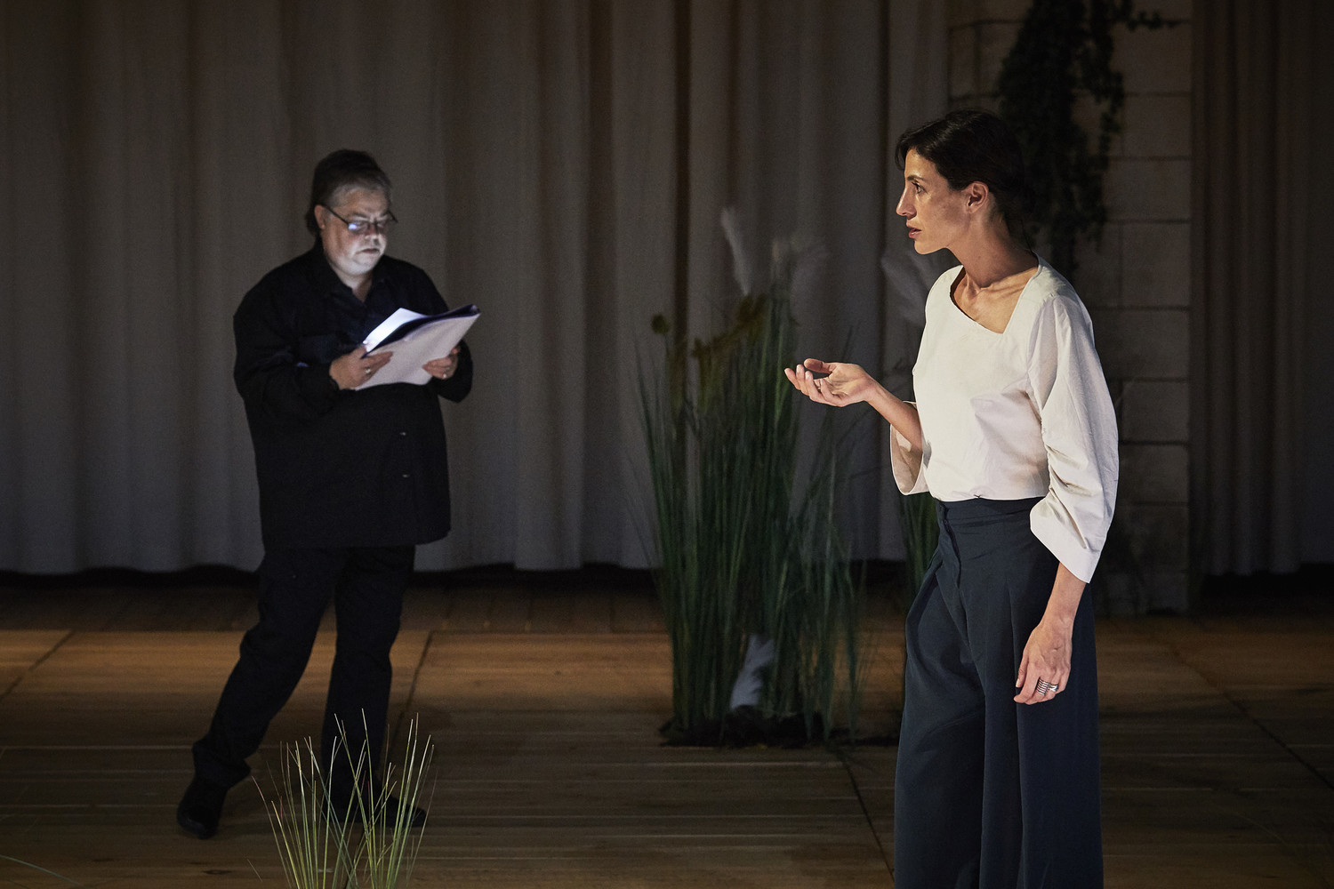 Это определенно старый театр, давно переживший свой расцвет (бельгийский сценограф Томас Уолгрейв вдохновлялся руинами с картин Юбера Робера); в нем непременно должны быть призраки – и кто, кроме пожилой суфлерши, сможет вспомнить их истории? Не знаю, насколько многозначно оригинальное португальское название спектакля Sopro, но его французский аналог Souffle того же происхождения, что и однокоренное слово souffleur. Суфлер – полная, нарочито неактерского вида дама в черной прозодежде, та самая Кристина Видал, поделившаяся с Родригешем своей биографией – ни разу не покинет сцену, и весь текст молодые и подтянутые актеры будут произносить с её подачи, превращая неслышный залу, невесомый, как ветер, шепот в четко артикулированные слова.