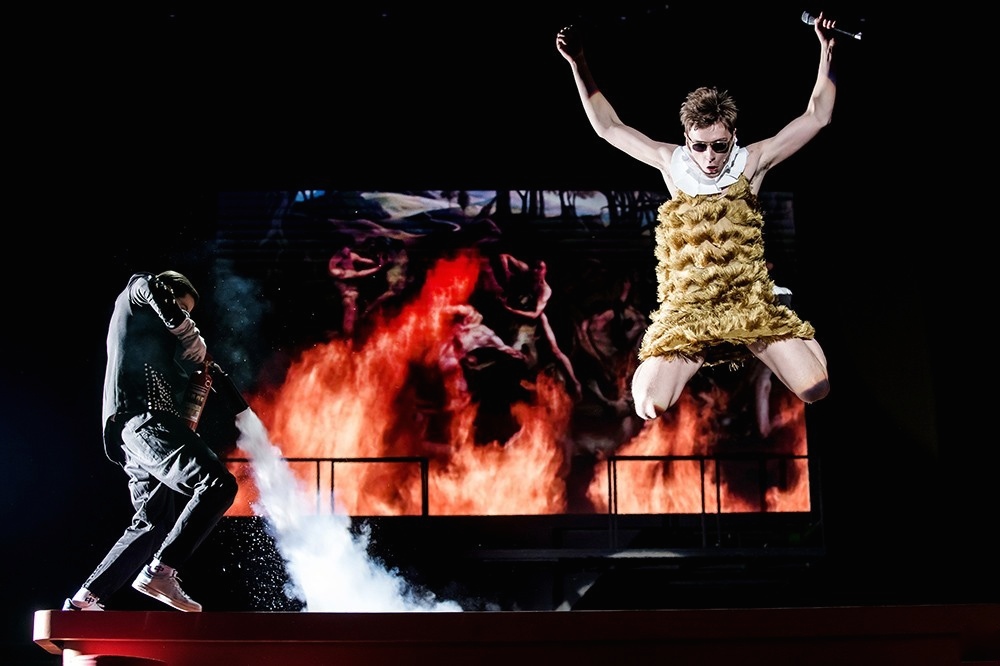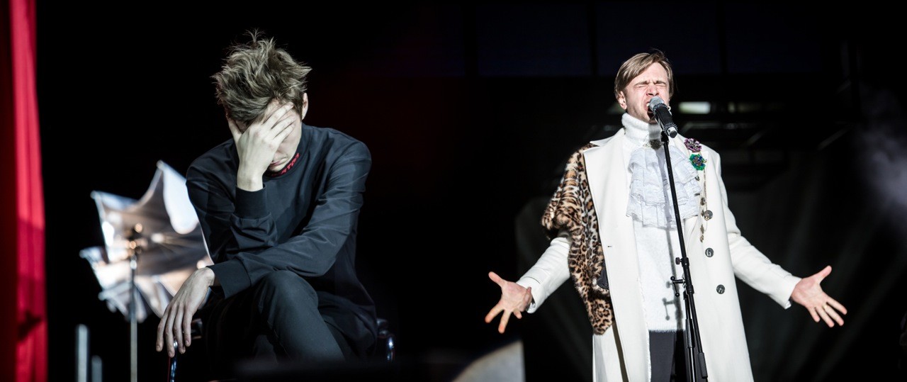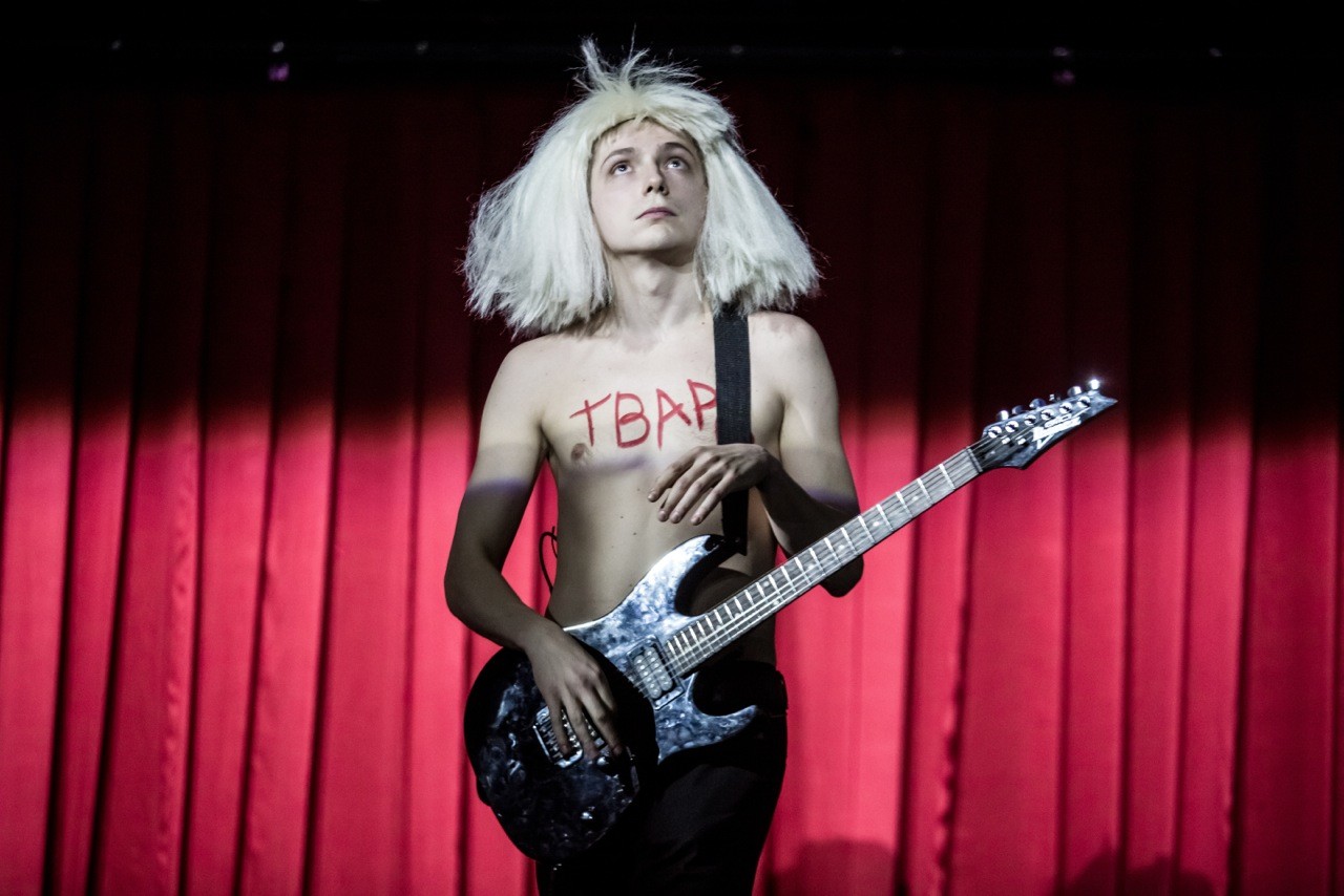 Впрочем, воздержусь от стихов, дабы не быть уподобленным Оронту. У Быкова же вместо легкой современной пьесы вышел неповоротливый гомункул, резонерствующий так, как Мольеру и не снилось. Текста много, он доминирует над действием, подавляет его, иногда сводит на нет – и спектакль превращается в вялотекущее talk radio. Хотя Сеньков по-разному – то мюзиклом (музыку Дмитрия Жука исполняет маленький ансамбль на сцене), то фарсом – постоянно стимулирует шоу. К чести актеров «Гоголь-центра», они даже вот такое умеют произнести достойно, живо и, насколько это возможно, интересно. Но одно лишь слово «Тварь», которое Альцест-Горчилин выводит у себя на груди (в момент полного разочарования в Селимене; кстати, линию с тайным письмом, попавшим в руки горе-любовника, Быков провалил – с письмом тут просто непонятка; о каком вообще письме в век электронной почты речь?), действует сильнее всех потоков быковского ямба; это и вербальный, и визуальный жест, в котором агрессия и беззащитность – родовые черты Альцеста – слиты неразрывно.